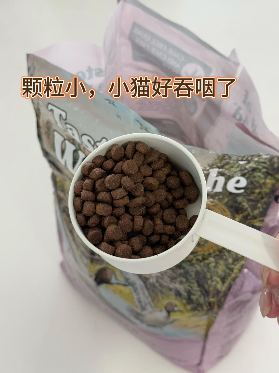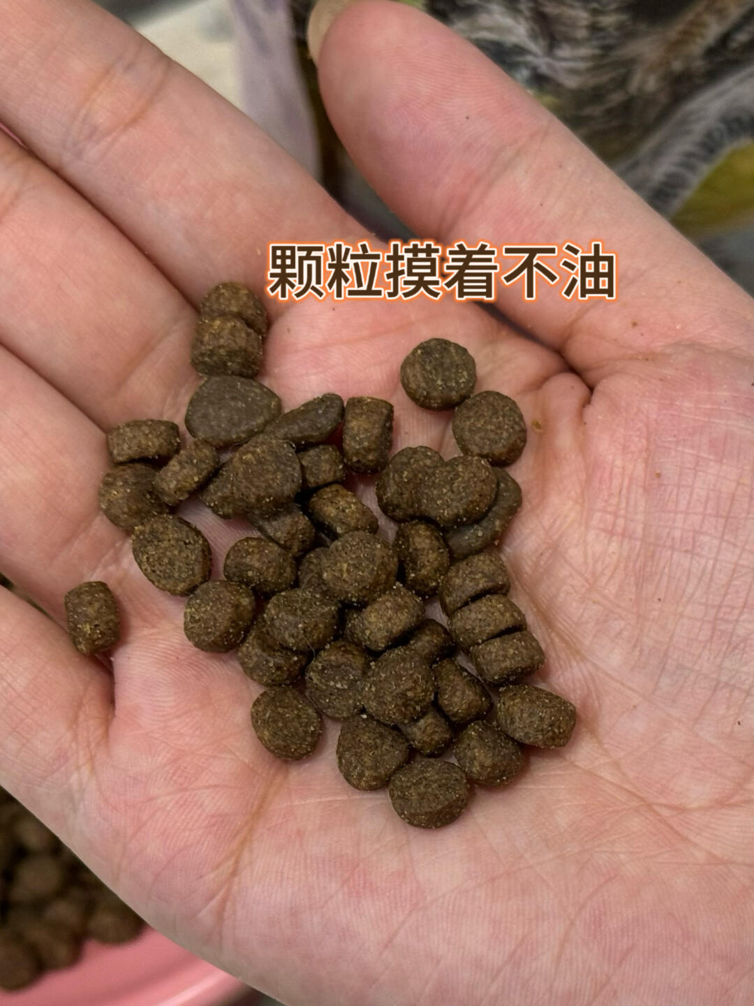 猫粮摸着就不油,猫碗上也没油垢,小猫吃这么久都没黑下巴。颗粒比较小,小猫直接咽也没事。