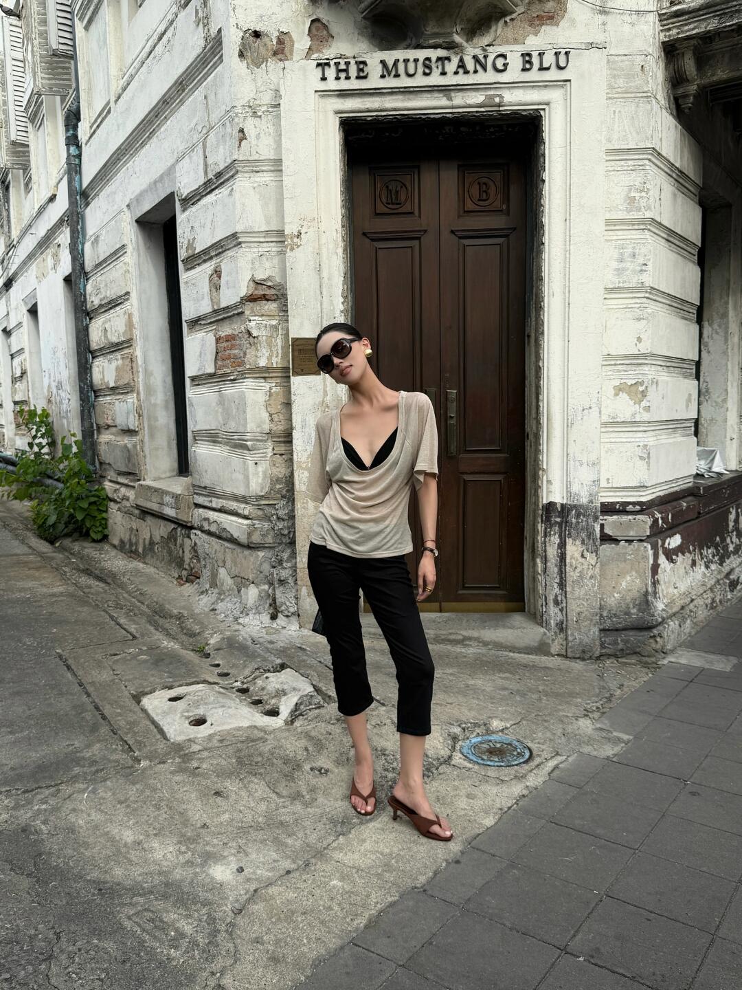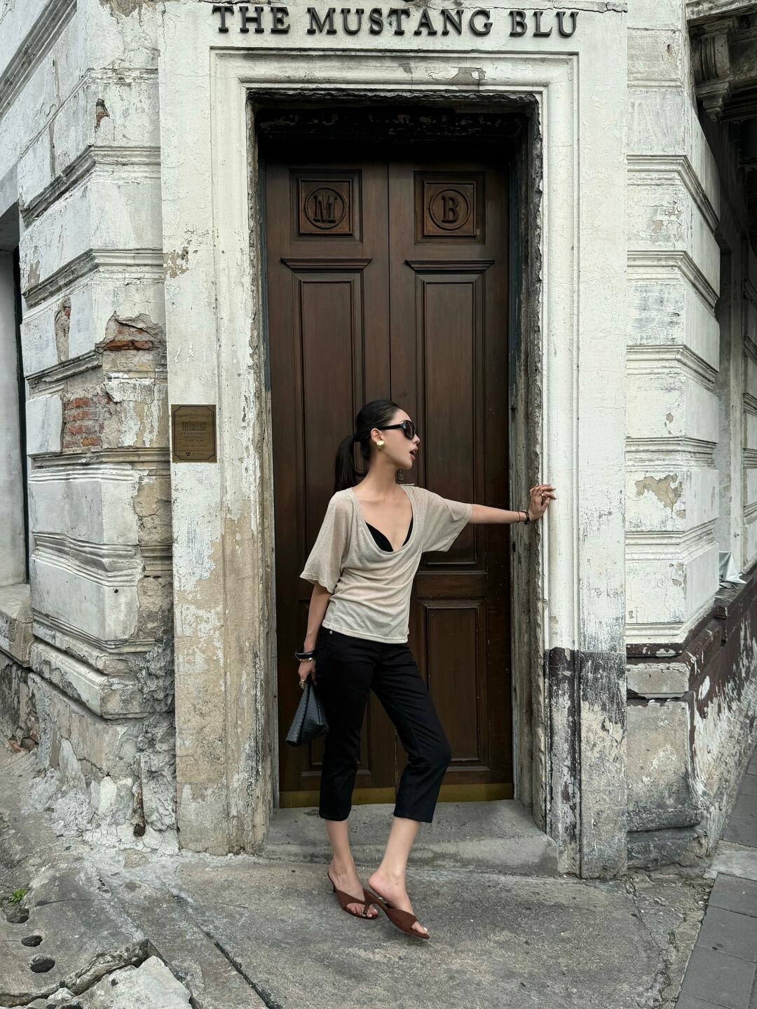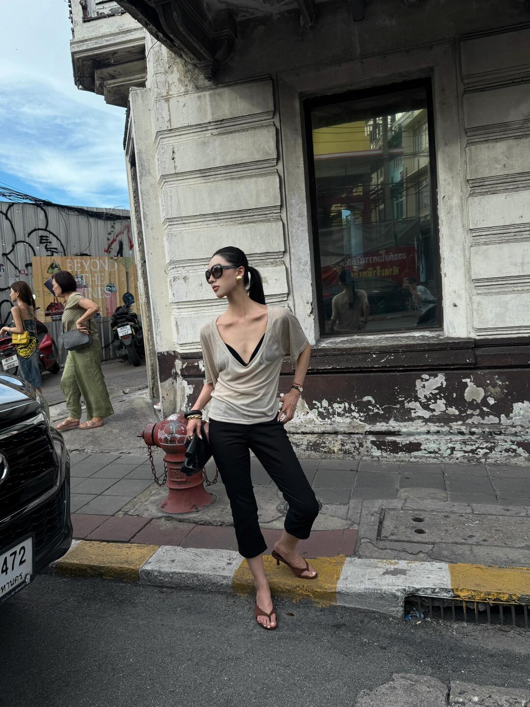 姐姐在溪边美得像幅自然画卷!黑色紧身衣勾勒出曼妙曲线,米色裤装衬得身姿挺拔,低丸