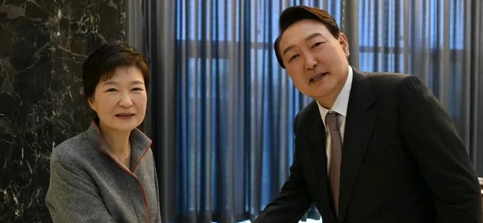 朴槿惠和马云握手,朴槿惠和比尔盖茨握手,画面和谐很美好。男女都有慕强心理,遇到强者那眼睛里的欣赏都掩藏不住。朴槿惠和尹锡悦握手,在韩国当总统貌似下场大多都不好,他们俩也不例外。