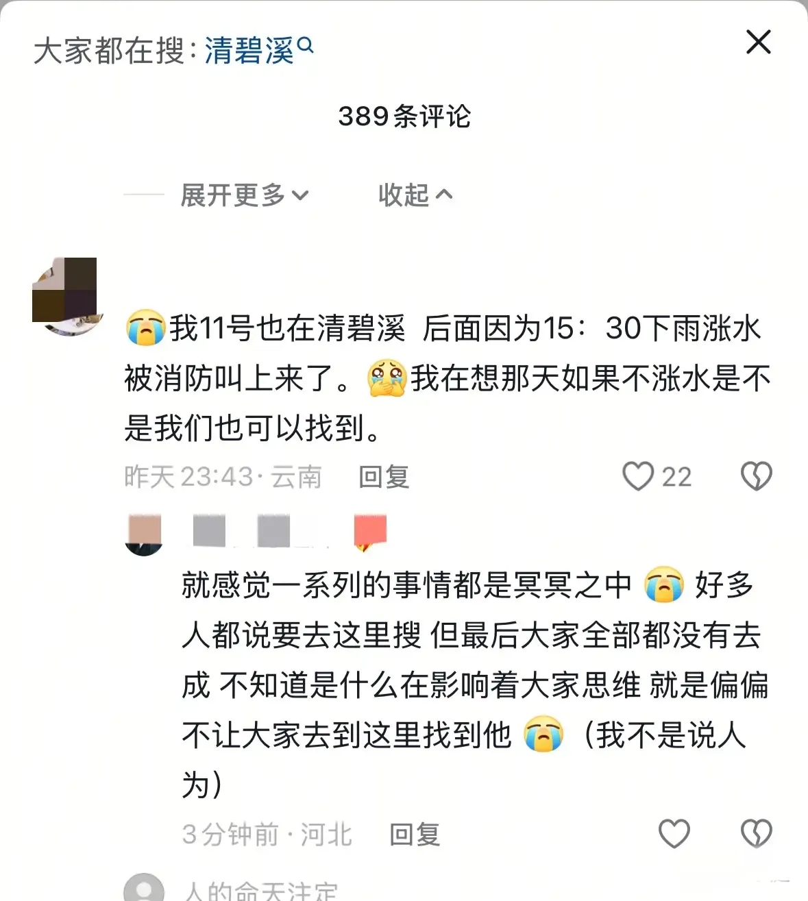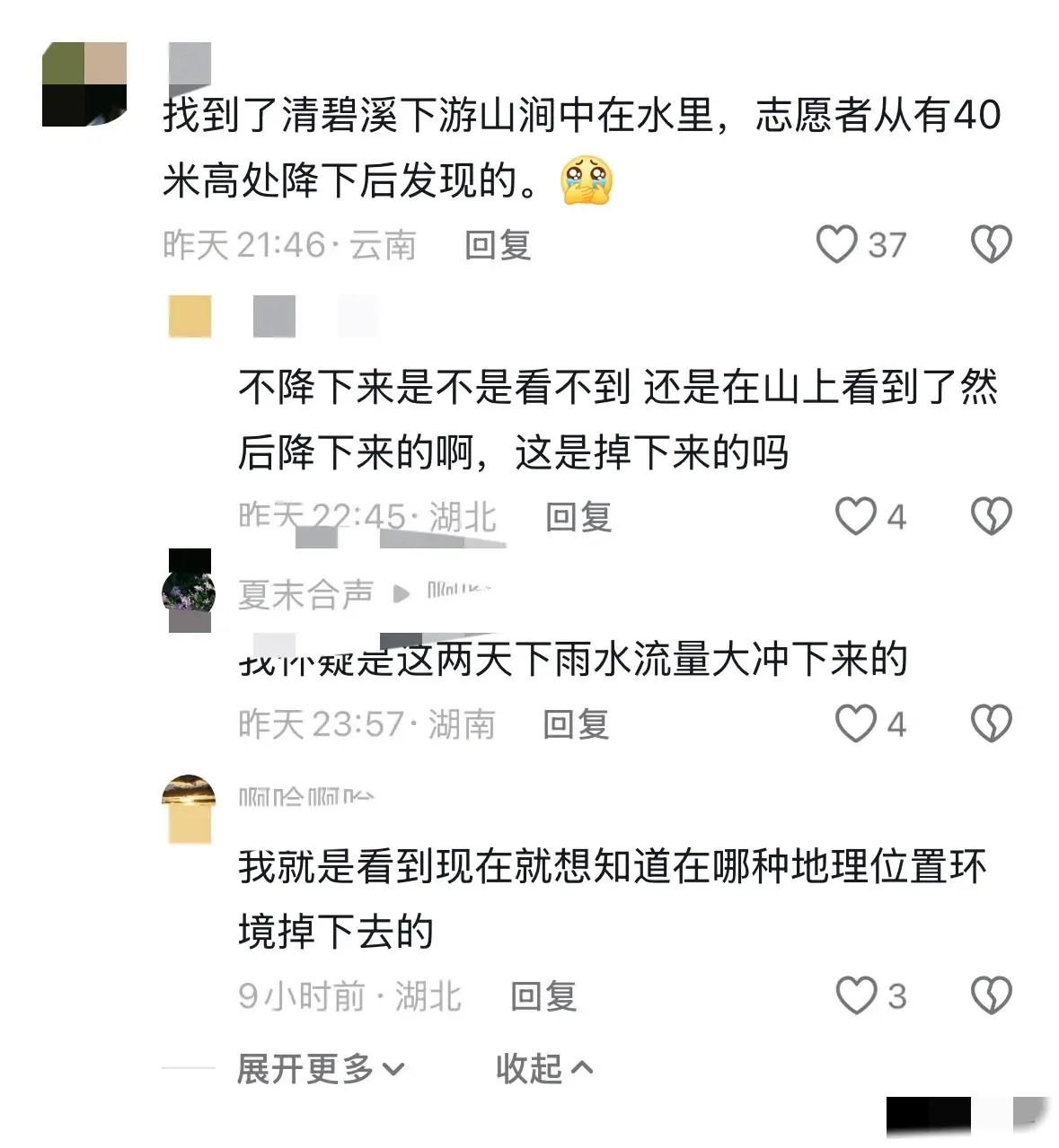 我们去的时候、地势很危险、清碧溪已经有别的志愿者也找过了,但是孩子失踪的地方在上游,很多人觉得孩子走不那么远,也就错过了提前找到男孩的机会。