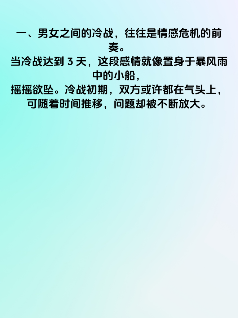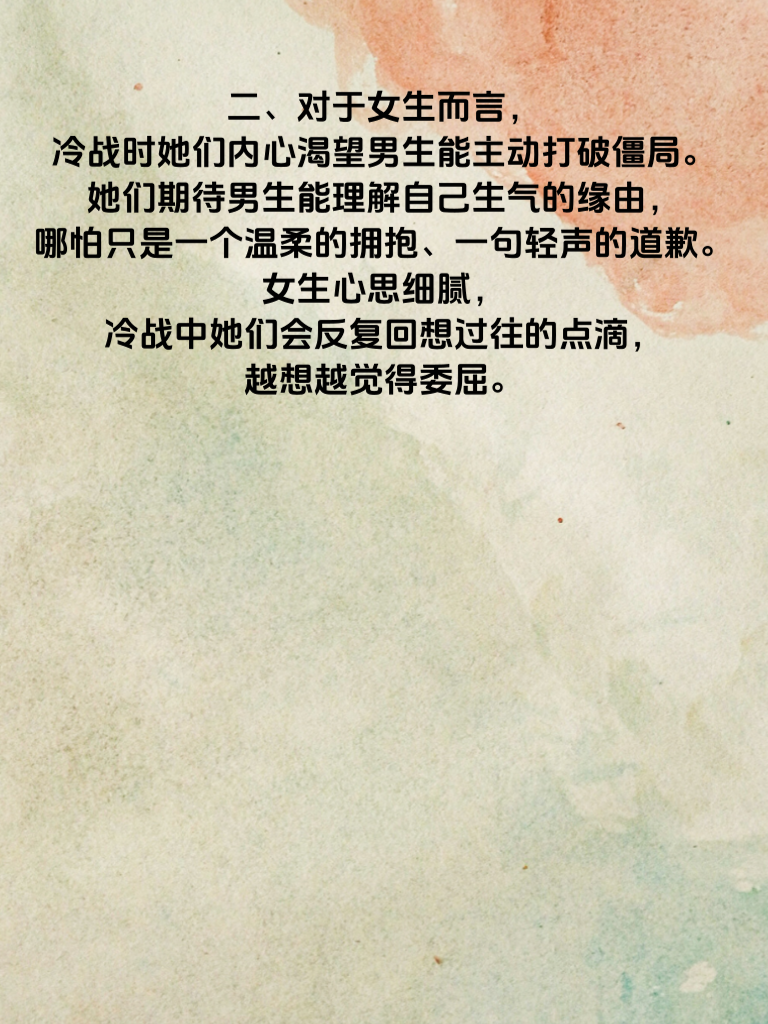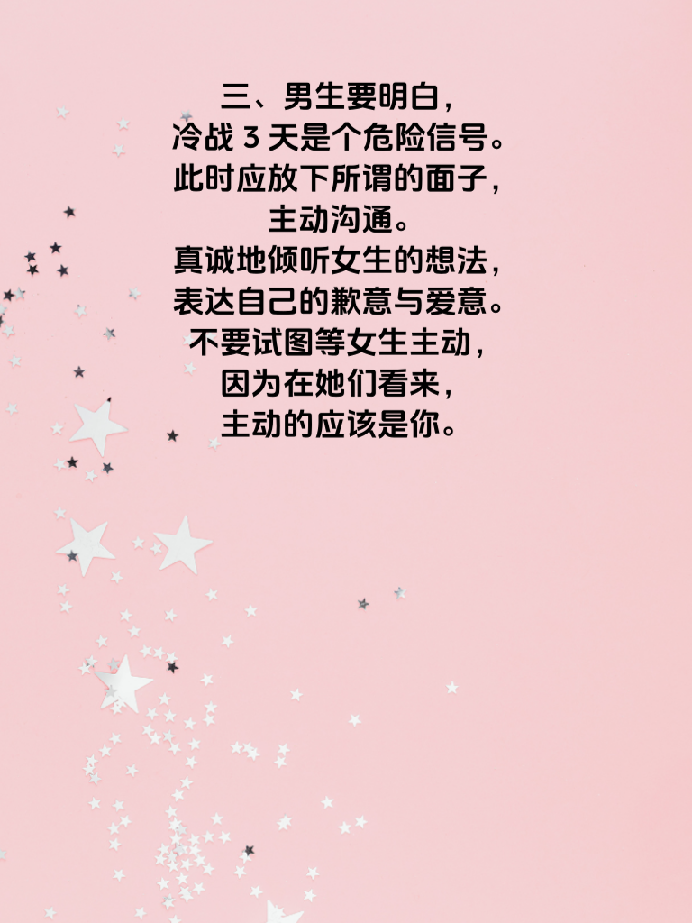一、男女之间的冷战,往往是情感危机的前奏。当冷战达到3天,这段感情就像置身于暴风雨中的小船,摇摇欲坠。冷战初期,双方或许都在气头上,可随着时间推移,问题却被不断放大。 二、对于女生而言,冷战时她们内心渴望男生能主动打破僵局。她们期待男生能理解自己生气的缘由,哪怕只是一个温柔的拥抱、一句轻声的道歉。女生心思细腻,冷战中她们会反复回想过往的点滴,越想越觉得委屈。 三、男生要明白,冷战3天是个危险信号。此时应放下所谓的面子,主动沟通。真诚地倾听女生的想法,表达自己的歉意与爱意。不要试图等女生主动,因为在她们看来,主动的应该是你。 四、爱情经不起冷战的消磨。及时化解冷战危机,才能让感情重回正轨。用心去经营,用爱去呵护彼此,别让这3天的冷战成为爱情的转折点,错过本该美好的未来。