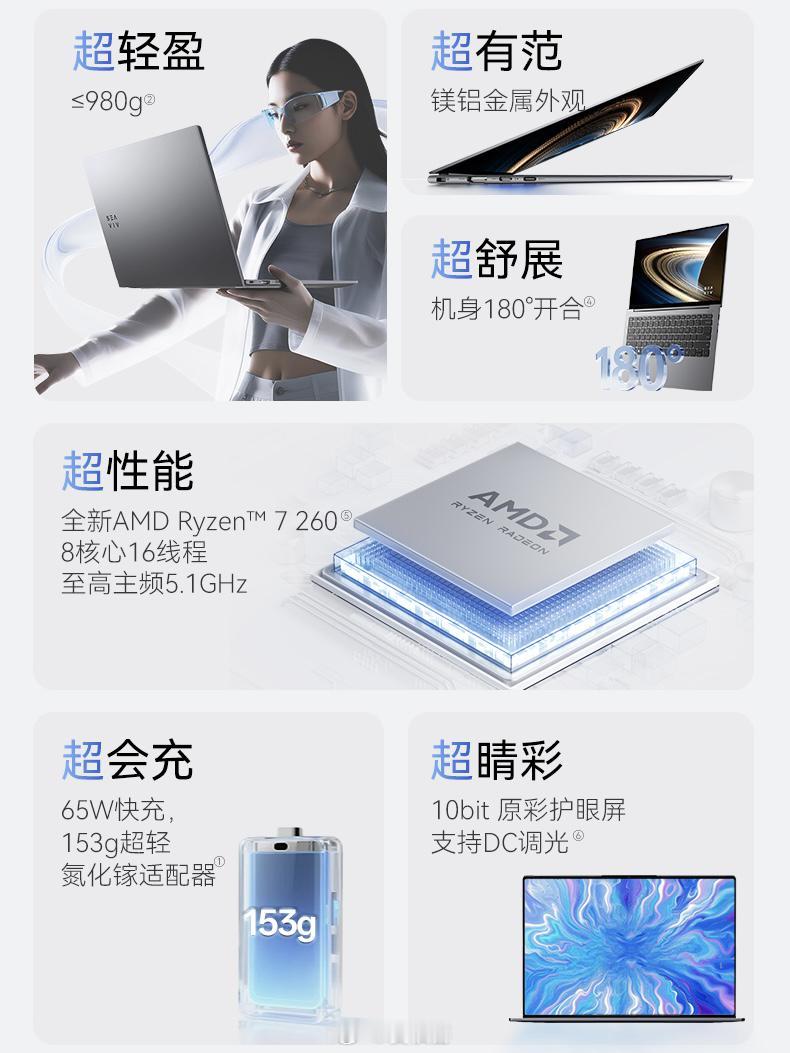 10H 续航 + 65W快充(153g 超轻适配器),快速补电和便携性双解;