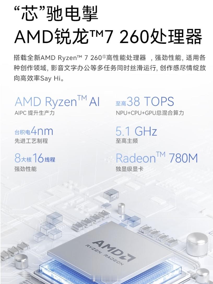 980g轻薄镁铝机身里,塞着 AMD 锐龙 200 系 AI 处理器(8 核 16 线程,混合算力达38TOPS,性能强劲)