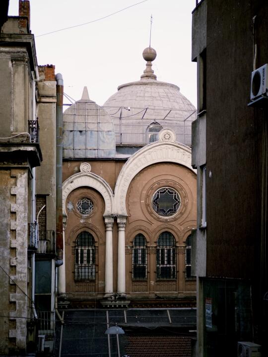 清晨,蓝色清真寺的宣礼塔在晨雾中若隐若现;