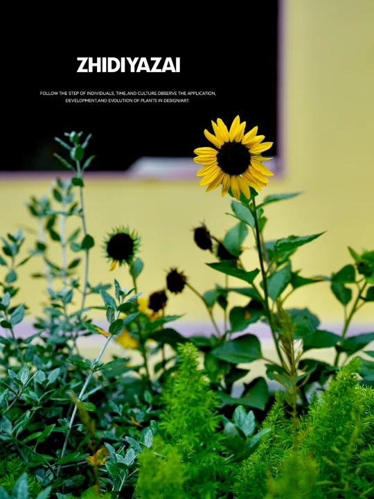 呼应多巴胺色系的门头 添加了向日葵、圆锥绣球、花叶络石等植物元素 为门头增添色彩元素