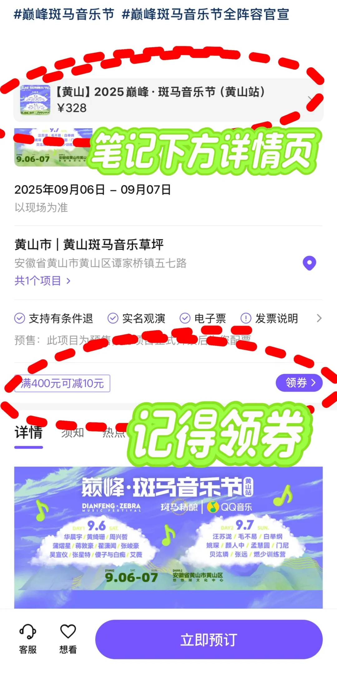 音乐节大魔王华晨宇来黄山啦! 2025斑马音乐节9月6日开唱,地点在黄山斑马音乐草坪! 门票已开售,直接买就能减10元,还有超多实力歌手同场,定好闹钟抢票啦!