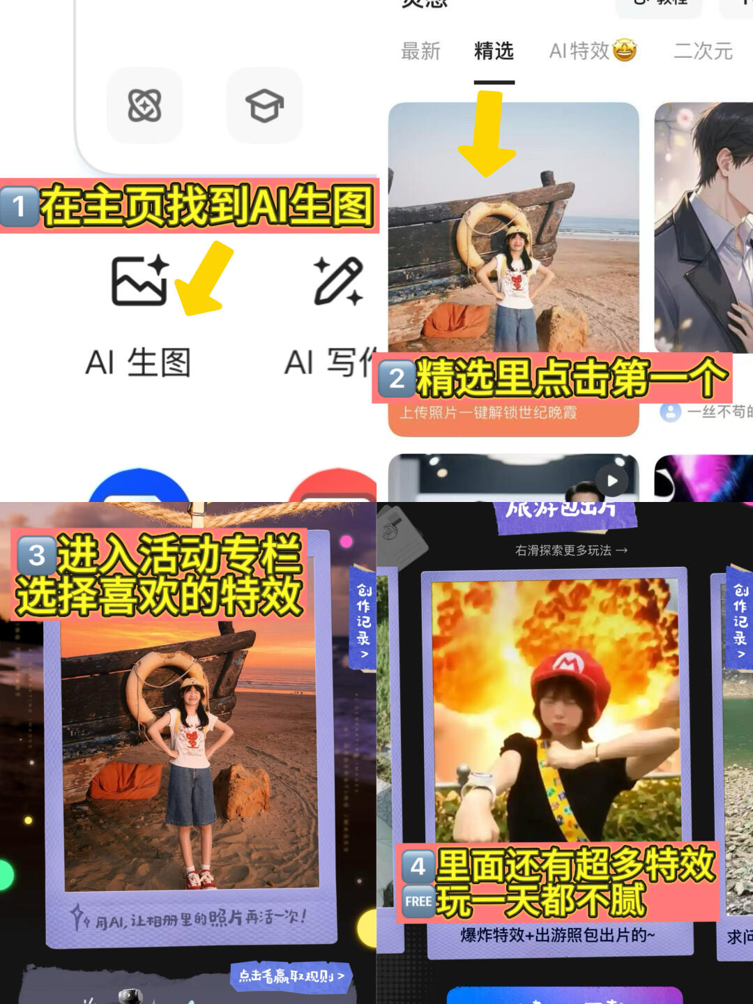 🔴p图教程: 打开夸克的AI生图 ➡ 灵感页 ➡ 点击第一张图进入活动页(看图六) 🔵照片选择建议: 动作越夸张俏皮 成片越好看! 穿搭尽量要五颜六色 越彩越靓! 这样选择的照片进行特效生成真的好有网感 用夸克AI生图,不用繁琐P图 一键就能生成,好适合咱们懒人! 除了大头特效,活动页还有各种分身小人风格特效,还可以一键换天空,玩一整天都不腻❗️