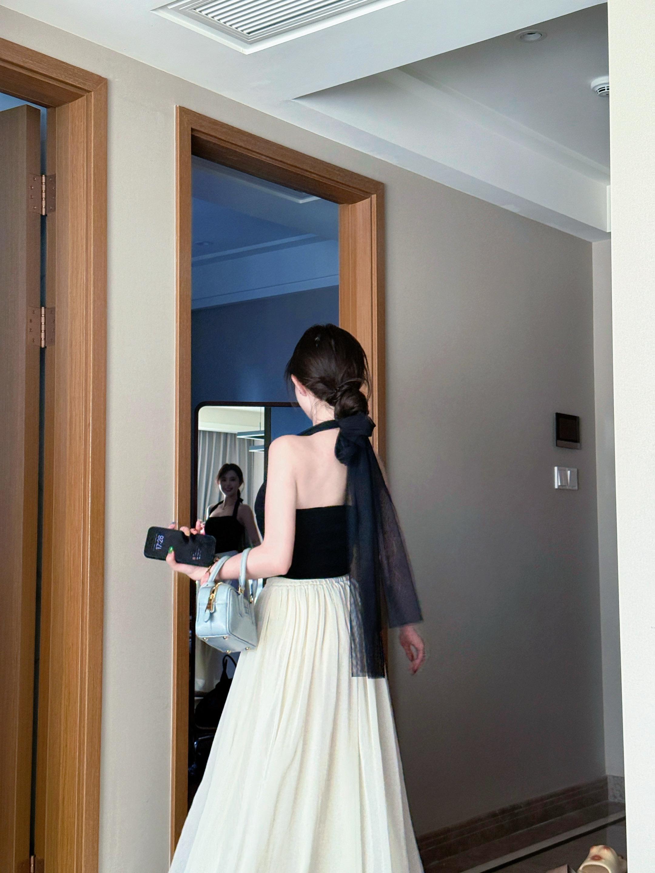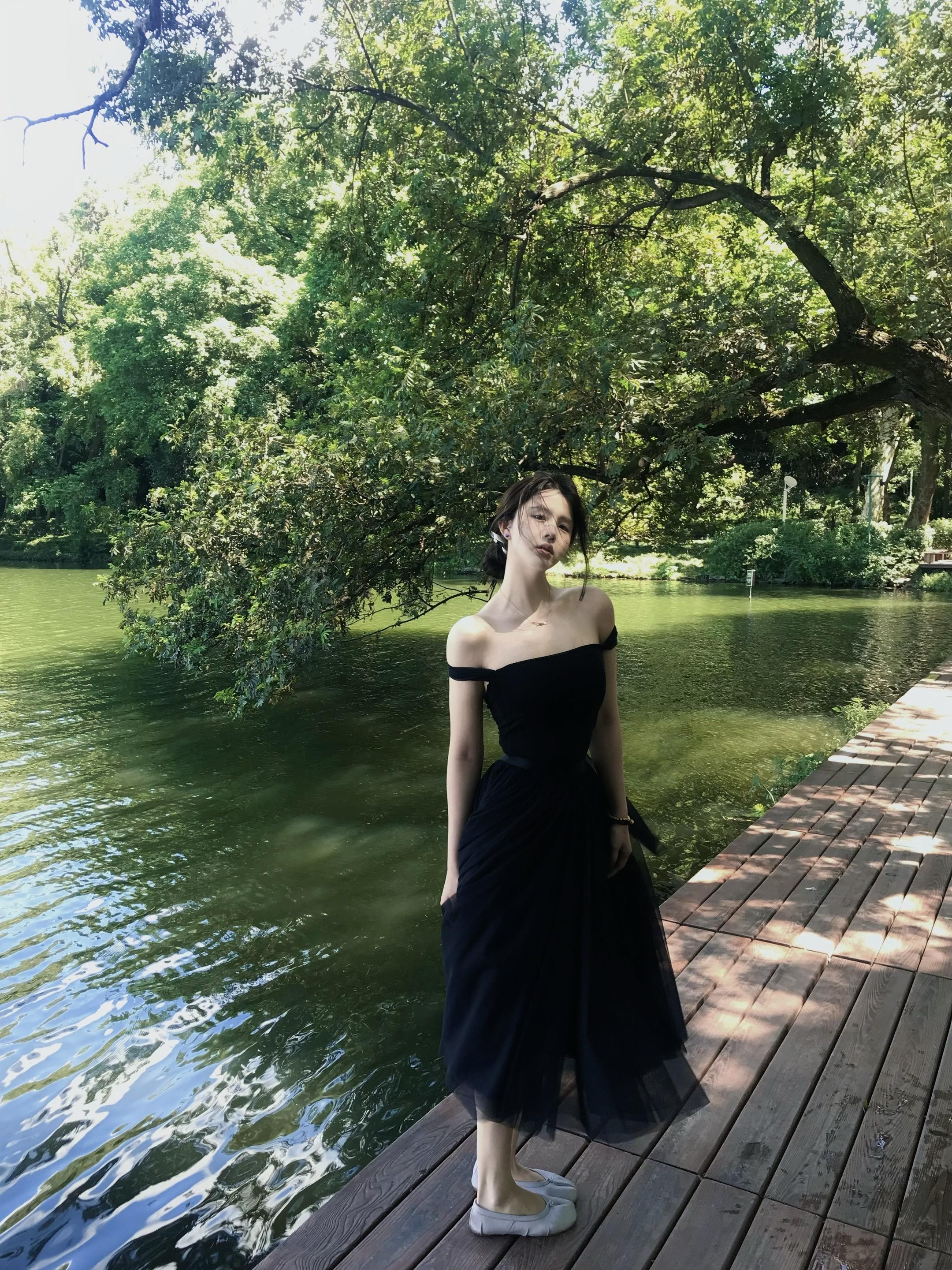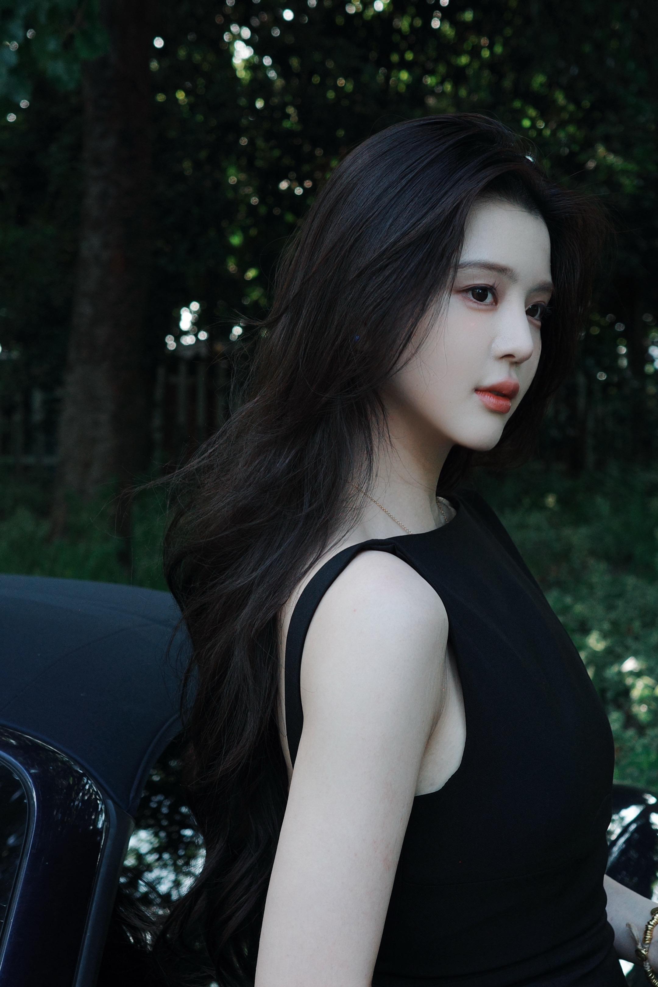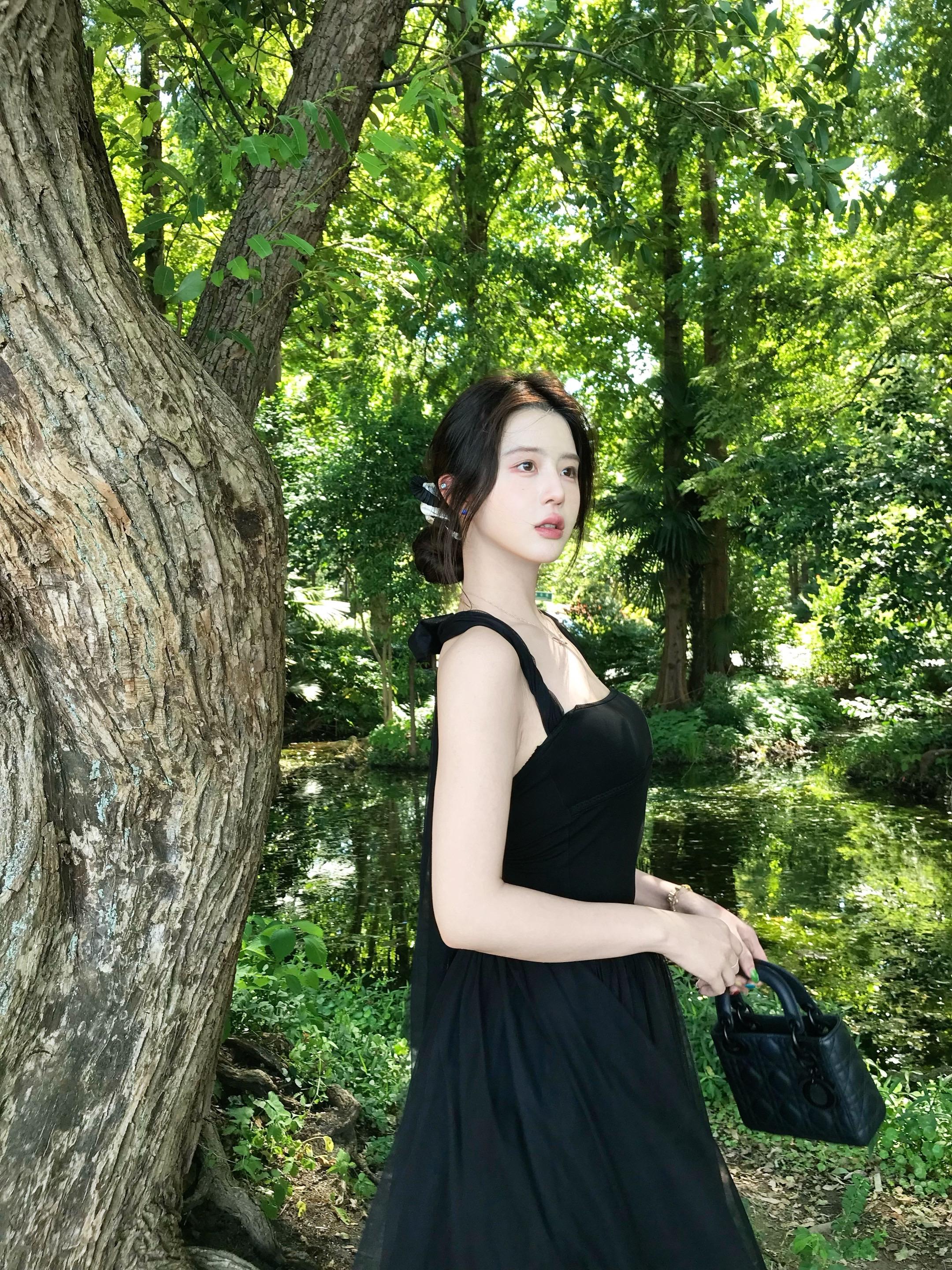 姐姐在溪边美得像幅自然画卷!黑色紧身衣勾勒出曼妙曲线,米色裤装衬得身姿挺拔,低丸