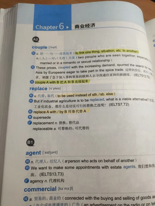 [大笑R]这16大主题语境涉及学校教育、社会话题、交通旅行、农业环境、科技发展等,拿“商业经济”篇为例,涉及词汇以A1-C2级别分类,头一个单词couple编入A2级别,分别有关于couple的解释、举例、搭配、扩展、替换等若干类,即可体会“五位一体”词条设计的优势。