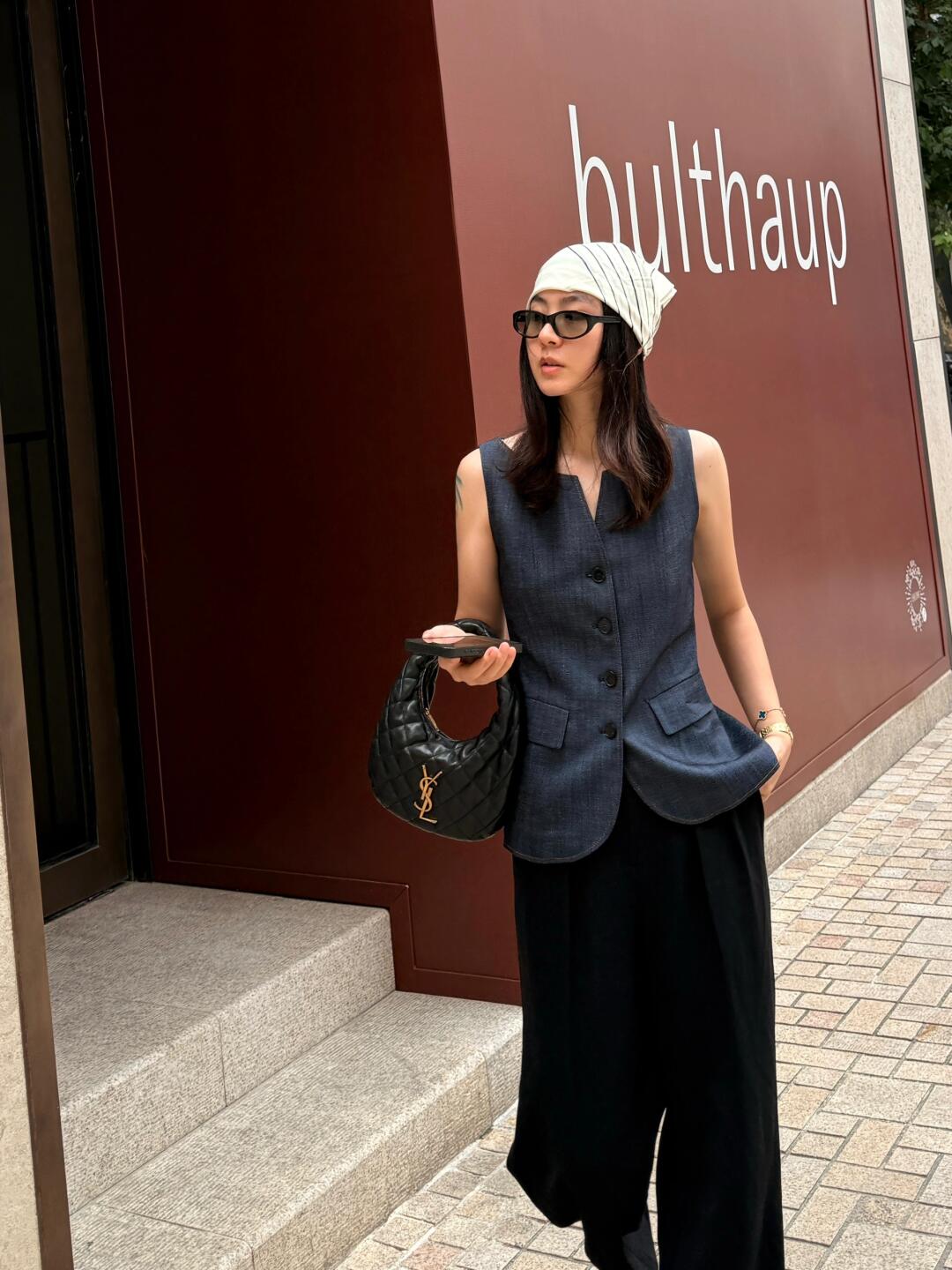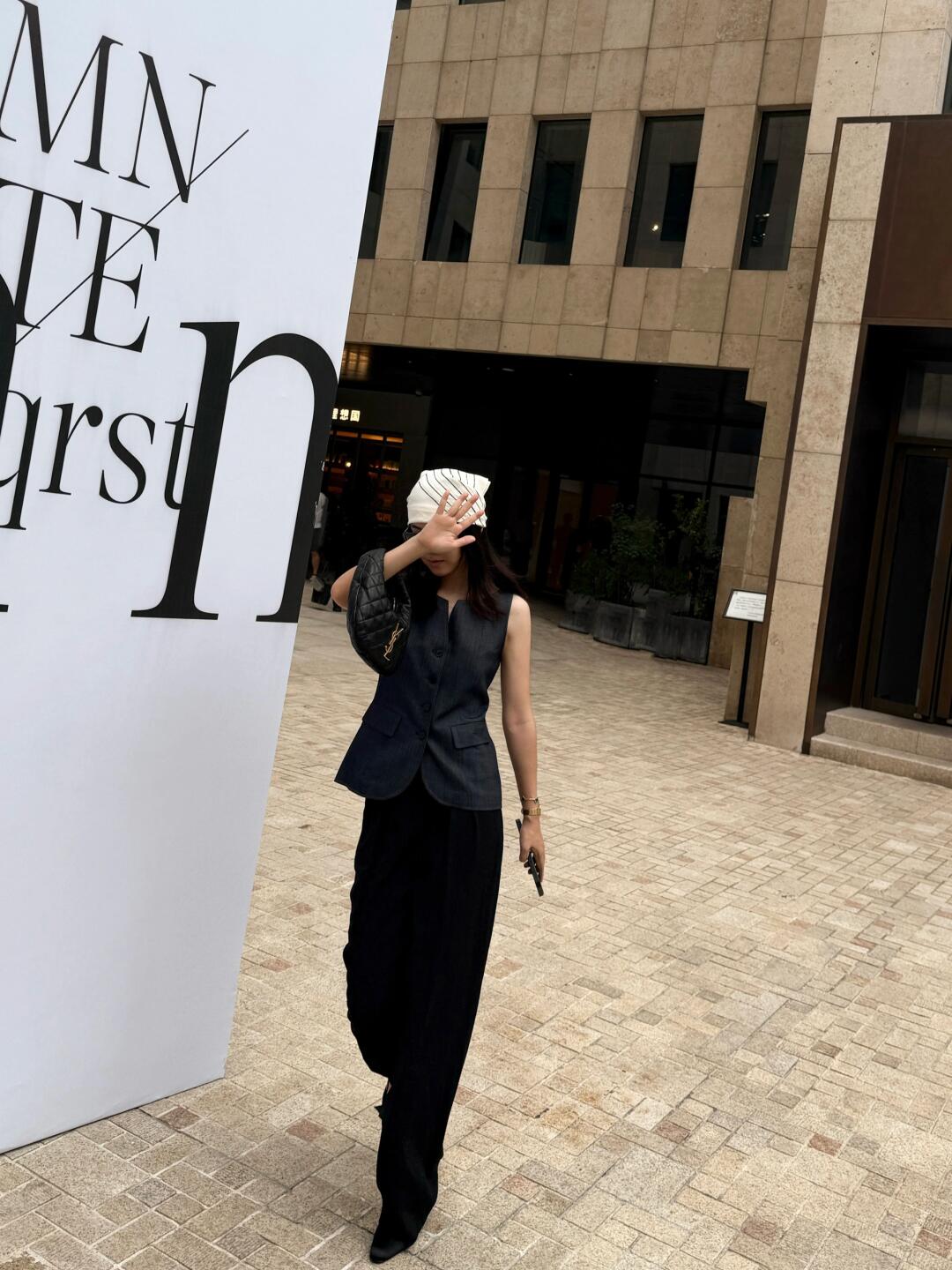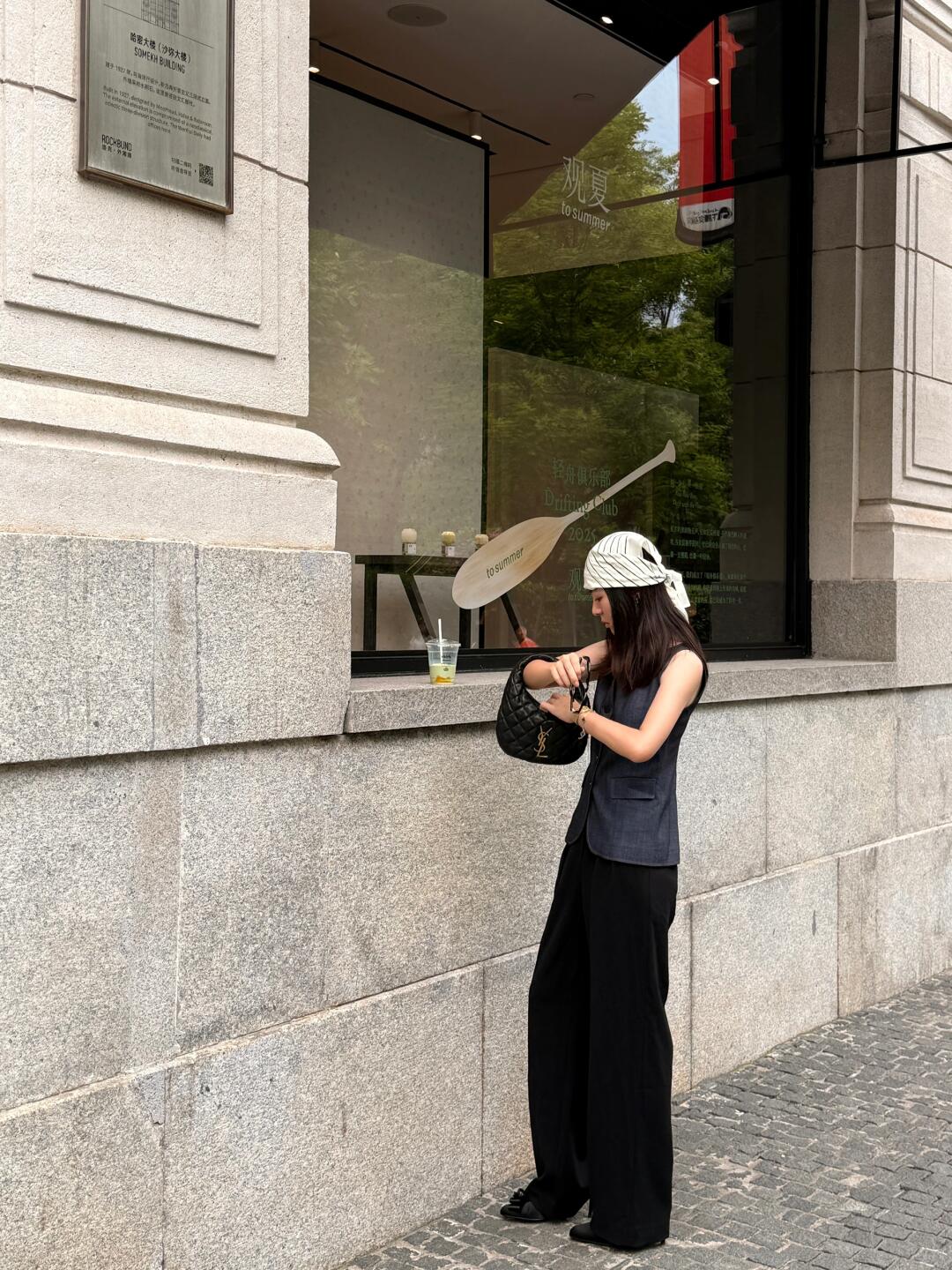 这家新中式茶馆也太会拿捏氛围了!亮面黑外套+黑丝的搭配,又酷又撩,露肩设计刚好中