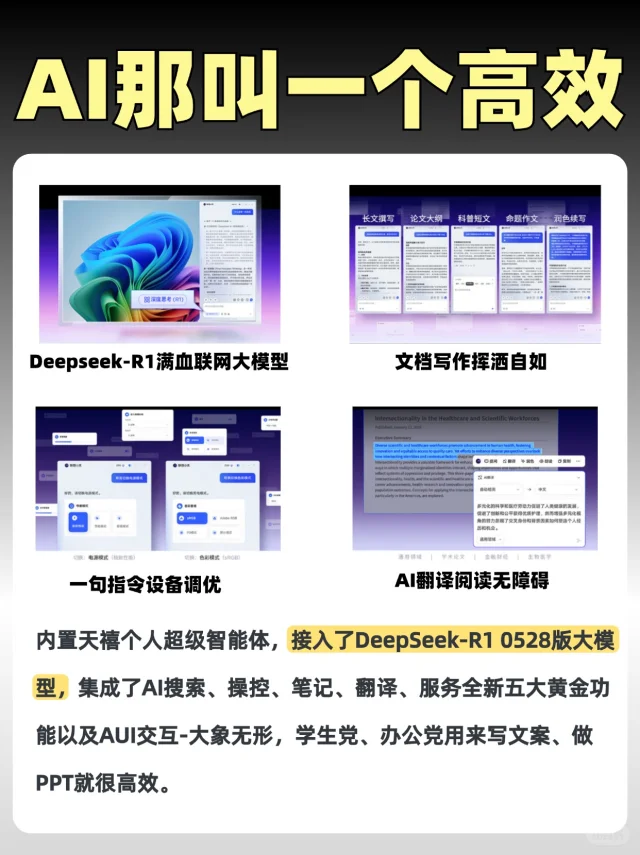 内置天禧个人超级智能体,自带AI搜索、AI笔记,AI翻译、AI操控、AI服务五大黄金功能。查资料和文献用AI搜索功能一键解决所有问题,写论文涉及到外文资料也可以用AI翻译,快速又准确,导师都得对你赞赏有加;甚至做PPT都可以用它排版美化,节省时间提升效率。