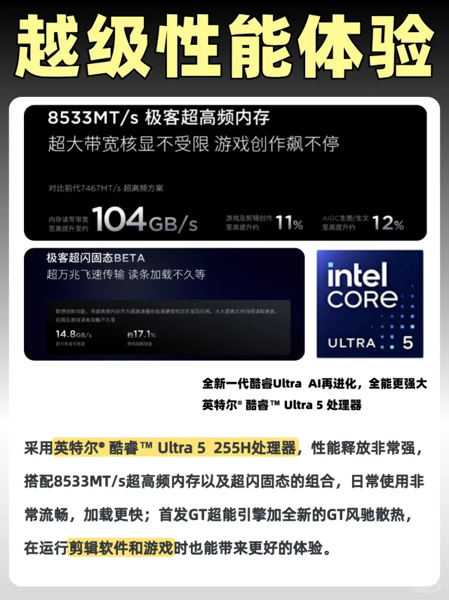 全新一代酷睿Ultra Al再进化,全能更强大!联想小新GT系列采用英特尔® 酷睿™ Ultra 5 处理器,性能非常给力,搭配8533MT/s超高频内存以及超闪固态的组合,日常使用非常流畅,加载更快;首发GT超能引擎加全新的GT风驰散热,运行多个软件不卡顿,甚至在剪辑视频,做图以及跟同学游戏开黑时也能带来更好的体验。