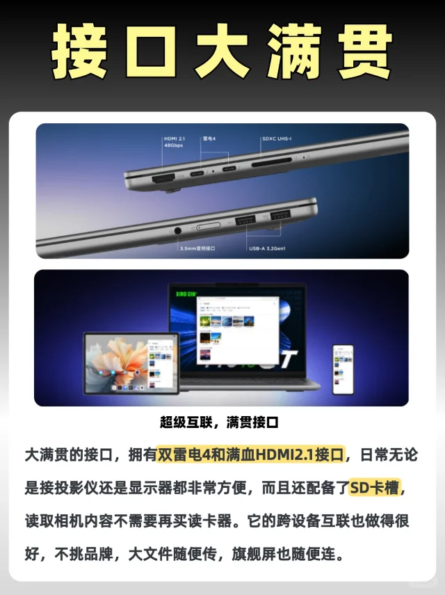 大满贯的接口,拥有双雷电4和满血HDMI2.1接口,还可以直接插SD卡,接投影仪、显示器等设备就很方便,联想超能天线 450 米远距离联网,网速快信号强,宿舍抢课完全不慌~