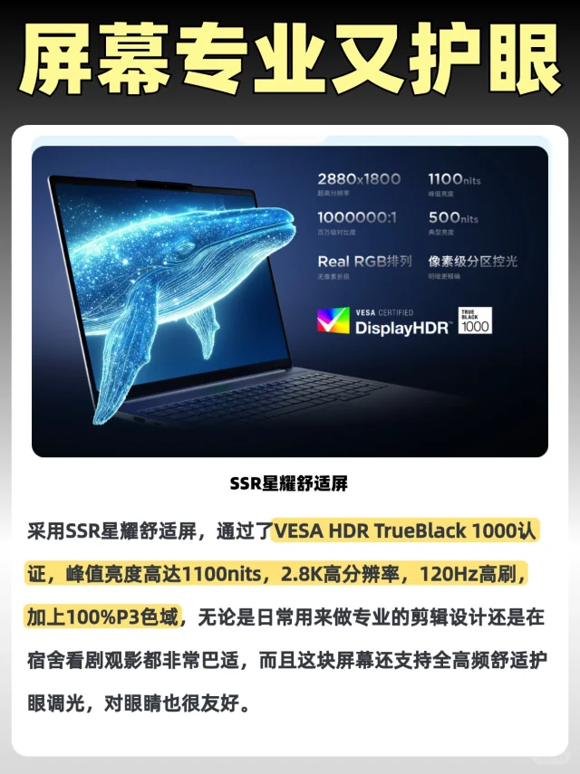 联想小新Pro16/14 GT AI元启版搭载VESA HDRTrueBlack1000认证的SSR星耀舒适屏真的超级能打,具备2.8K OLED 屏幕120Hz高分高刷广色域,简直就是学设计画图类专业的必备神器,白天在窗边学习或者追剧也能看到高清画面,它还支持全高频舒适护眼调光,对眼睛很友好!