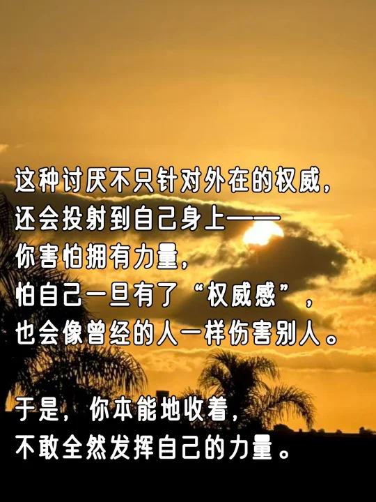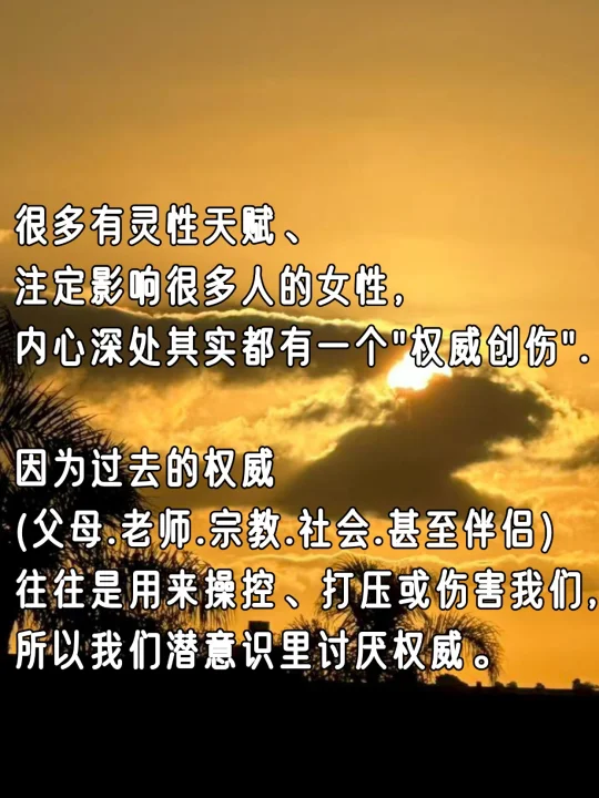 很多有灵性天赋、注定影响很多人的女性, 内心深处其实都有一个 “权威创伤”。 因为过去的权威(父母、老师、宗教、社会、甚至伴侣) 往往是用来操控、打压或伤害我们的, 所以我们潜意识里讨厌权威。 这种讨厌不只针对外在的权威, 还会投射到自己身上—— 你害怕拥有力量, 怕自己一旦有了“权威感”, 也会像曾经的人一样伤害别人。 于是,你本能地收着, 不敢全然发挥自己的力量。 💡要通过“阴影工作”(shadow work), 去面对并疗愈那些 和“被滥用的权威”有关的记忆、情绪和伤口。 释放掉之后, 你才会真正拥抱自己的力量。 ✨ 一旦你能接纳并发挥自己的力量, 你的声音、存在感、 以及在网络上的影响力, 都会自然扩大、爆发。