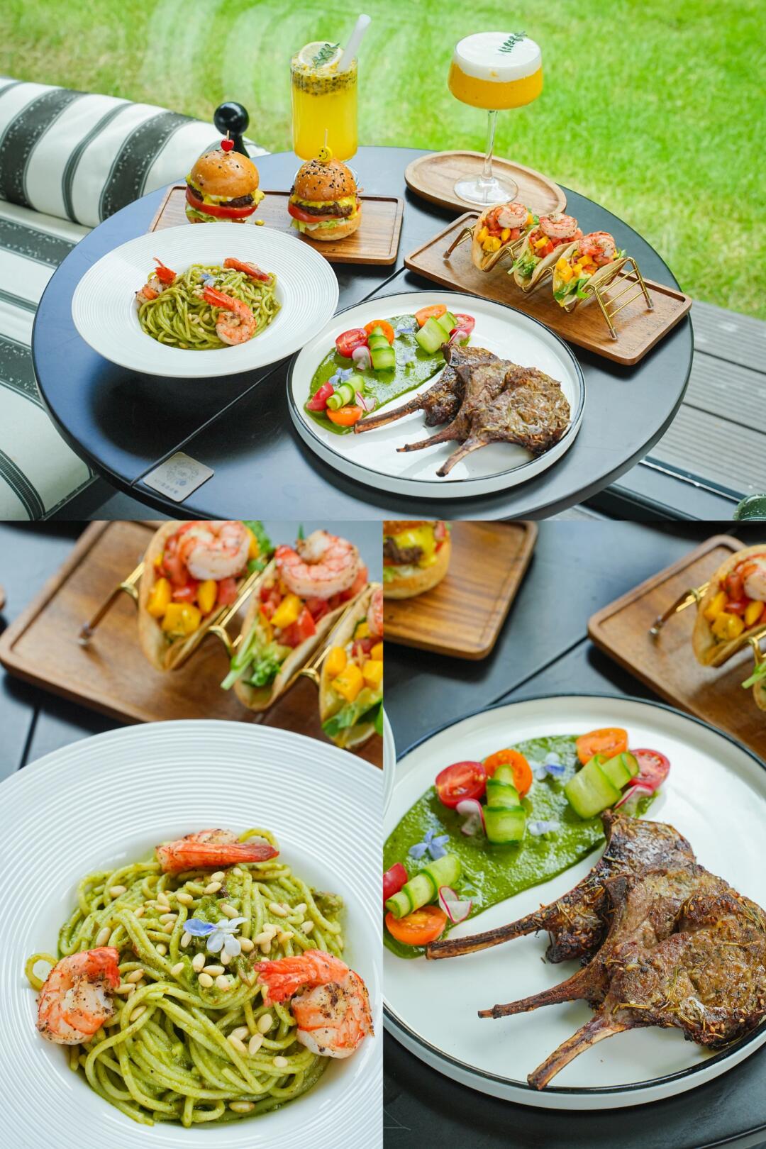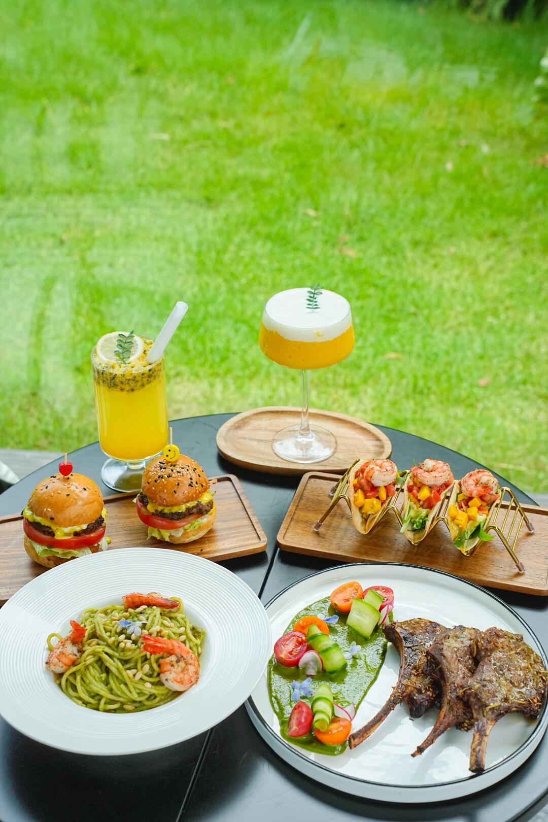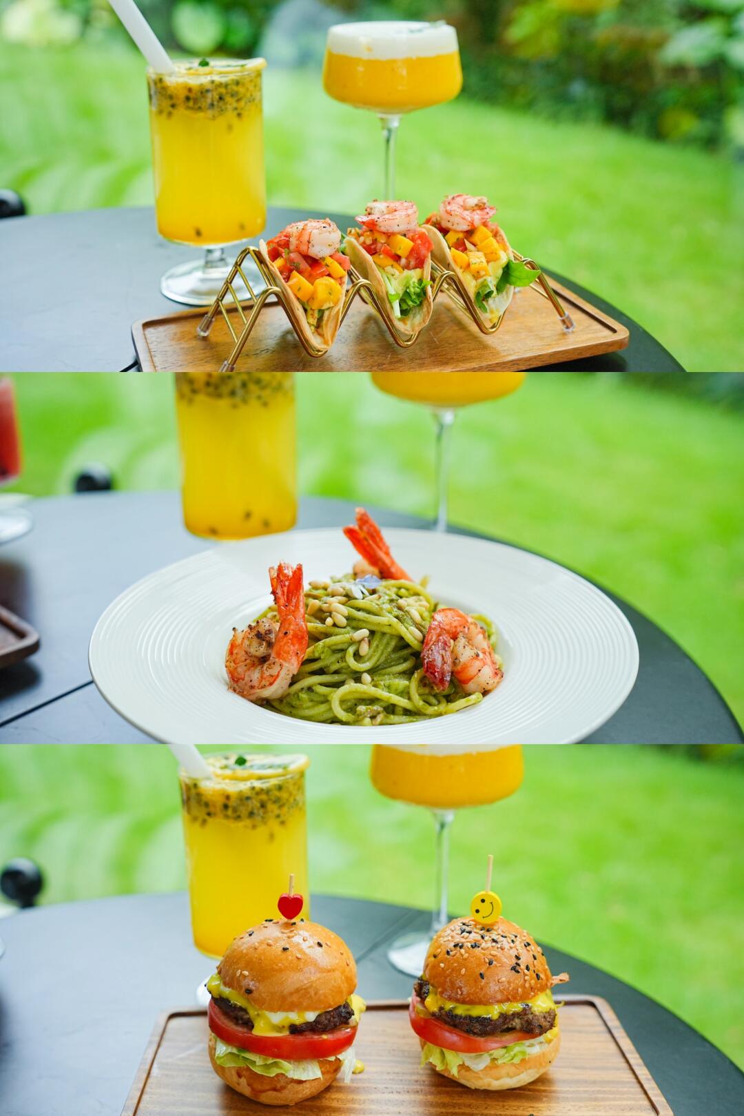 🍸特色饮品:一杯百香果柠檬冰沙酸甜解腻,另一杯橙黄色特调带着绵密泡沫,插片绿叶瞬间氛围感拉满!坐在落地窗边,阳光透过绿植洒在餐品上,每一道都像从 ins 里抠出来的📸