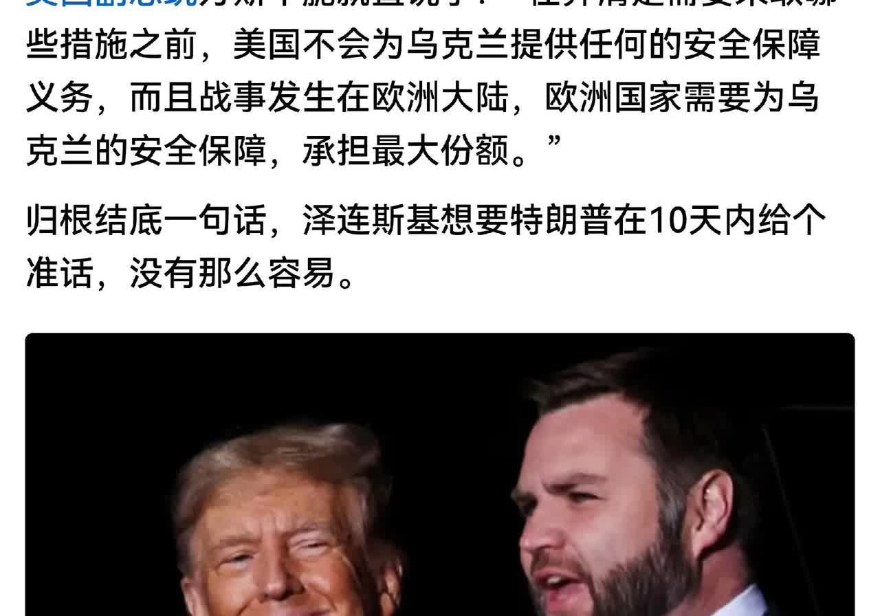 泽连斯基哪来的底气这么咄咄逼人,又是自主挑选谈判地点,又是催促美国赶紧拿出安保措施,还限十天内答复。起初觉得泽连斯基咄咄逼人是有什么底牌在手,可想来想去除了欧洲这个后台外,再没有什么叫板的资本呀。当爆出乌军死亡名单被泄密的消息后,终于明白了,泽连斯基不是真有底牌,而是彻底急了。战死170多万,兵力已枯竭,哪有资本再对抗俄罗斯啊,欧洲给再多的援助,乌克兰也是必输无疑,所以寻求安全保障成了当务之急,当然能拉来北约垫背最好。 泽连斯基的小算盘打的挺好,但美国副总统万斯的一句:在弄清楚需要采取哪些措施之前,美国不会为乌克兰提供任何的安全保障义务…算是给了泽连斯基当头一棒。至于泽连斯基自主挑选谈判地点纯为保自己小命罢了,能拿捏得了普京? (图片来自网络)