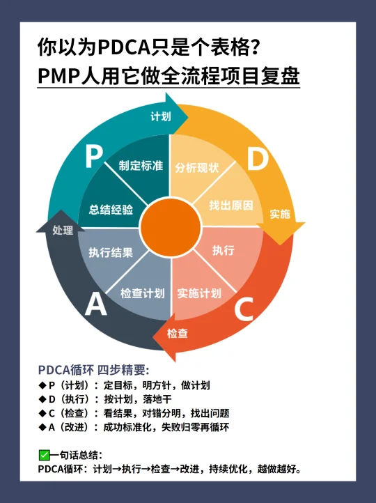 一张PDCA表,让我决定考PMP。 很多人以为PDCA就是写写计划、做做复盘。 我一开始也这么想,直到用它带项目时发现: ✅ 目标定了,但范围总变? ✅ 计划做了,但进度总 delay? ✅ 问题发现了,但改了又犯? 那时候才明白—— PDCA只是“术”,PMP才是“道” PMP教会我: 怎么控范围、管风险、算成本、带团队, 让PDCA不再靠自觉,而是有体系地落地。 现在我的PDCA表,底层是PMP的逻辑。 项目不再救火,汇报也更有底气。 👉 打【PDCA】撸娶可编辑模板