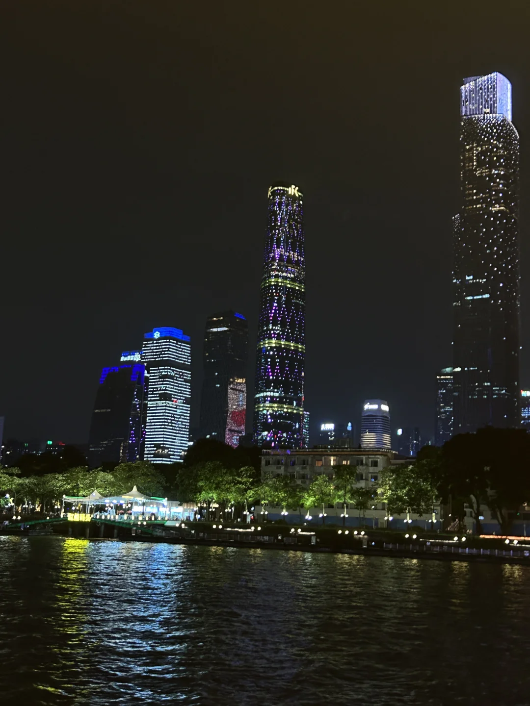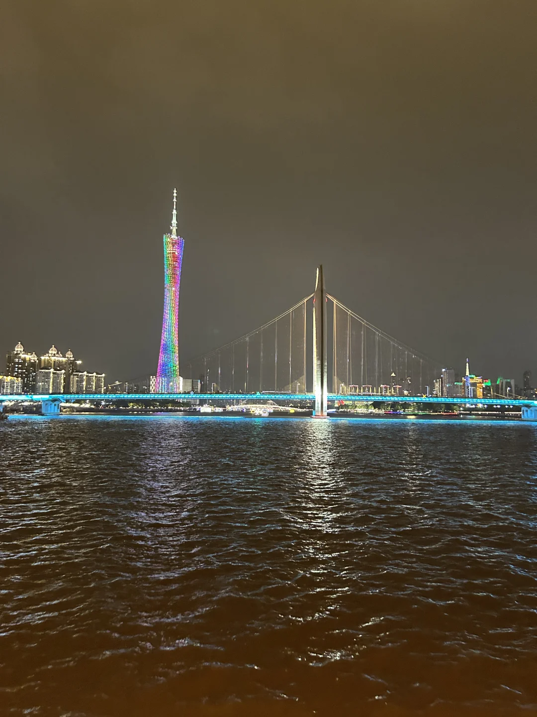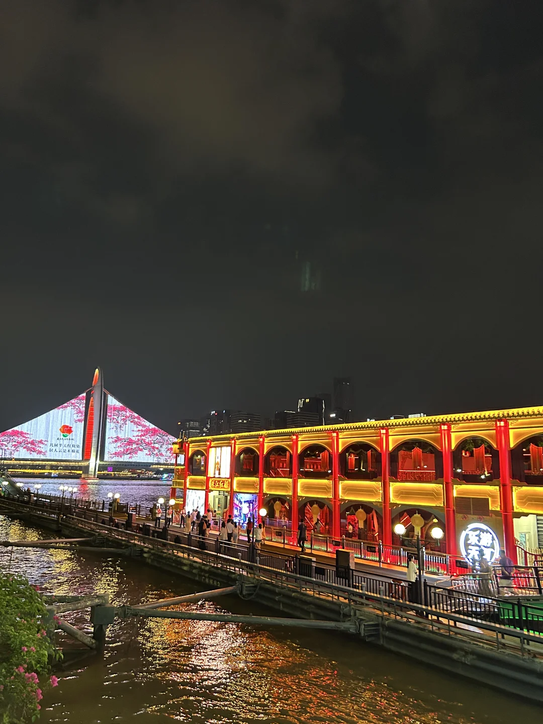 登船后没一会儿,船就缓缓开了!刚开始还能看到夕阳慢慢沉到高楼后面,等天色全暗下来,沿江的建筑突然一起亮灯,我和闺蜜直接异口同声“哇塞!”📸 广州塔像个发光的小蛮腰,一会儿变粉一会儿变蓝,灯光顺着塔身流转,连塔尖的“小灯串”都看得清清楚楚;猎德大桥的灯光像彩虹挂在江面上,船从桥底下穿过去的时候,抬头看超有氛围感,我举着手机拍了N张,每张都不用修图!