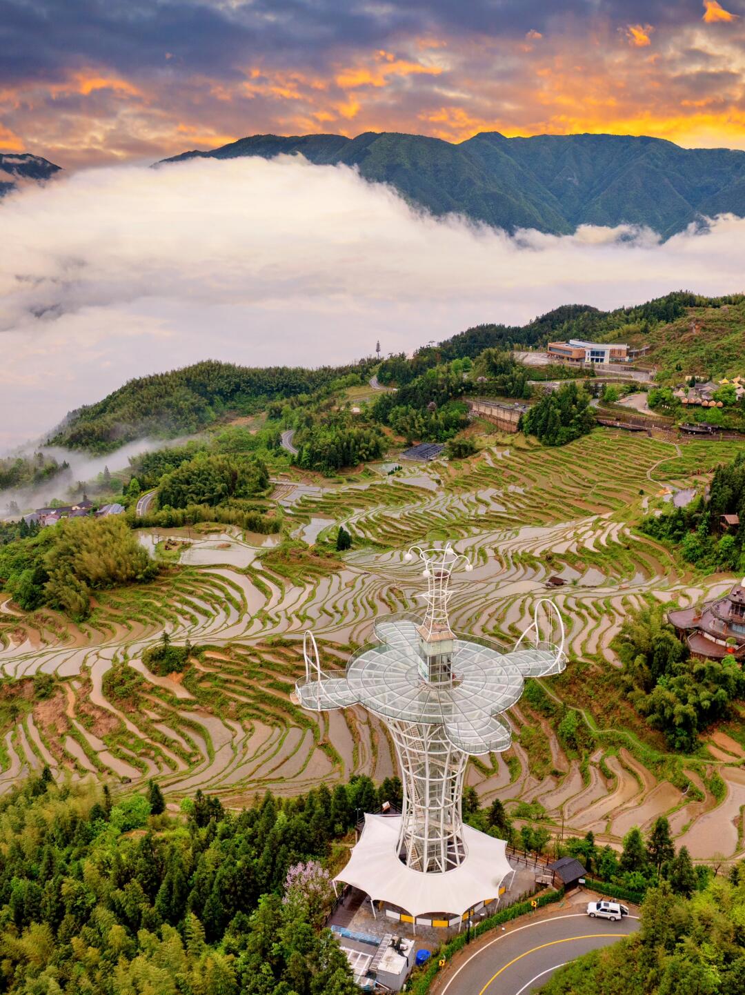 这里地势较高,是观云海日出的胜地。梯田的全貌逐渐展开,不同高度的植被变化也清晰可见。