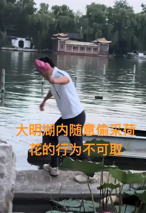 一名男子在游览大明湖时,发现湖中的荷花开的正艳,于是他跨过大明湖的石条护栏,来到荷花池中辣手摧花采摘了两支未开苞的荷花,花头明显还处于含苞待放阶段,看见喜欢的就想据为己有,这属于典型的占便宜没够的,出门不捡点东西都算亏的。如此众目睽睽,跨越护栏本身就不妥,再去辣手摧花野蛮采摘,能干出这事的除了素质低还要脸皮厚,二者缺一不可。男子的行为肯定是违反了游园的相关管理规定,甚至有可能触犯治安管理处罚法,建议对该男子拉入文旅黑名单。
