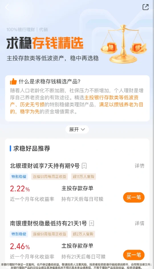 稳利宝里特别稳健的产品70%以上配的都是银行存款类的低波资产,想在现在的债市行情下稳稳赚点钱,可以看一些稳利宝里的【求稳存钱精选】专区,除此之外,稳利宝页面上的分类也蛮清晰的,想要历史日日正收益的,近期高收益的都有,适合自己的就好。