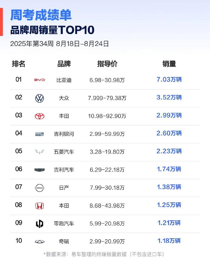连续4周销量第一,零跑:还有谁? 随着最新周榜成绩的出炉,我想8月份新势力销冠的竞争,应该已经提前落下帷幕,毕竟大家能够看到,上周新势力周榜第一又是零跑,单周销量达到1.2万台,再结合此前31、32、33周都是零跑夺冠,零跑现已实现“四连冠”,而且它上周新增订单达到12K,可见其销量增长后劲也很足,拿下8月销冠没啥问题。于此同时,零跑也是第一次进入到了所有车企周销量排行榜中的前十名,高于奇瑞(1.18万辆),距离本田(1.25万辆)仅一步之遥;在新能源品牌中更是排名第四,首次超越特斯拉(1.03万辆),并且是新势力中唯一过万的品牌。 而零跑今年能够厚积薄发,最主要还是它坚持全域自研+技术创新的发展方式,做到了每款车都是“好而不贵”,新车出一款爆一款。比如7月底上市的零跑B01,上市72小时锁单量就达10132台,仅用一周就下线了10000台,已成10万级纯电家轿之中的现象级车型。 至于零跑B01的热销密码,自然是在于同样的价格,它能给到越级的用车体验,比如11万级它就带有650km纯电续航,并且还配备了高通8295、激光雷达+端到端组合辅助驾驶的等15万级新能源车轿车才有的配置。可能有小伙伴会有疑问,为什么零跑能做到以成本定价,零跑的高管透露,这是因为零跑的零件通用率超过了80%,降低了成本,让利消费者。 按照目前不断向上发展的势头来看,零跑今年下半年销量成绩肯定还会创造不少纪录,成为年度销量冠军也不是没可能。