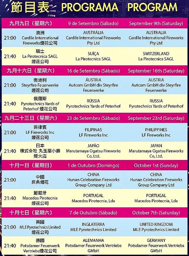 🕥烟花比赛汇演将于今年9月11日、16日、23日、10月1日(国庆节)、10月7日,澳门旅游塔对开海面上演,5个晚上每晚演出2场,合计1⃣️0⃣️场表演。由来自亚洲、欧洲及大洋洲的烟花公司精彩呈现。