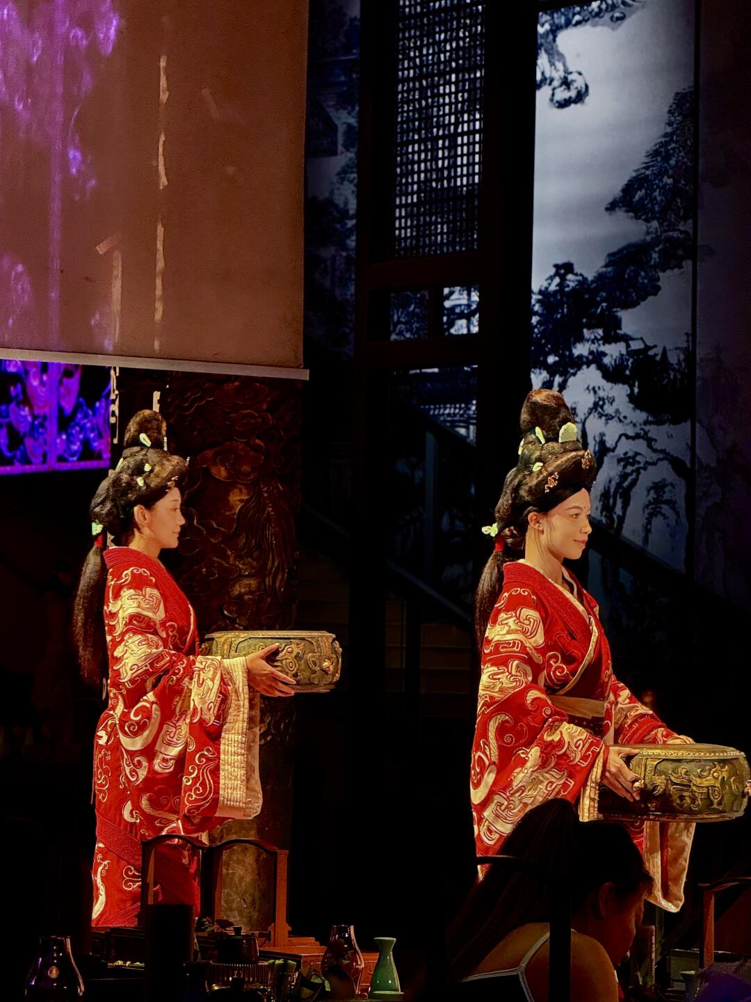 这次体验的是他们家夏季限定的《鹿鸣和乐宴》,不仅能吃到地道的宫保虾球、麻辣牛肉😋这些川菜精髓,更绝的是全程穿插着沉浸式演出——当宫女们手捧鎏金食盒,随着《明月几时有》🌕的音乐翩然而至时,突然就懂了苏东坡笔下"起舞弄清影"的雅致💫。