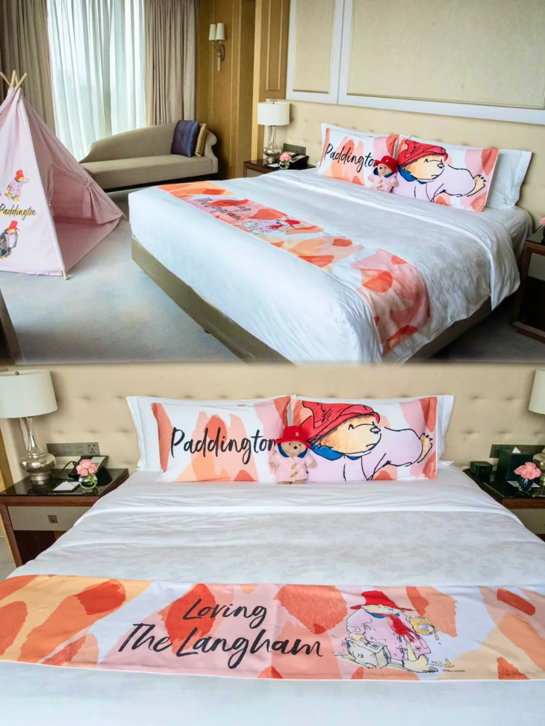 宽敞洁净的房间里都是帕丁顿熊🐻,连床上四件套都没放过,可爱的帕丁顿小熊出现在床头床尾🎈,我闺蜜一进来就迫不及待抱着枕头在床上滚来滚去,跟我说这个床太舒服了,哈哈哈~