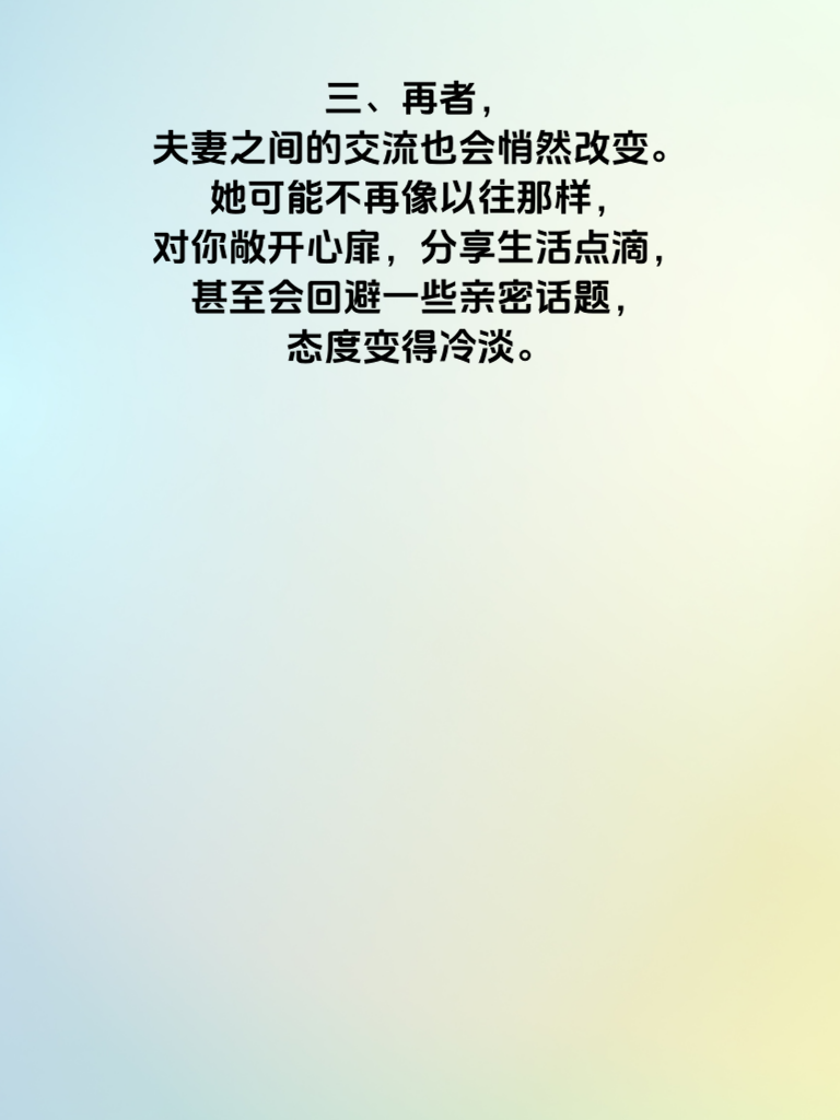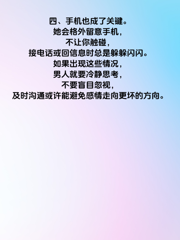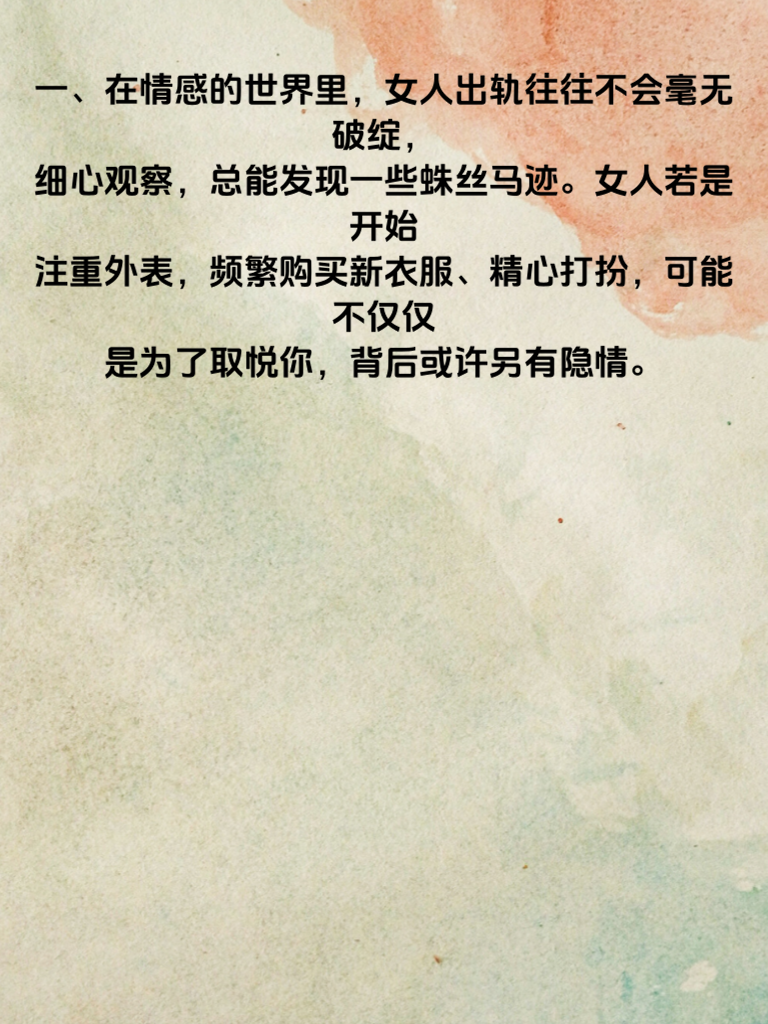 一、在情感的世界里,女人出轨往往不会毫无破绽,细心观察,总能发现一些蛛丝马迹。女人若是开始注重外表,频繁购买新衣服、精心打扮,可能不仅仅是为了取悦你,背后或许另有隐情。 二、她的日常行踪也可能出现变化。突然增加了许多外出时间,且对行程含糊其辞,不愿过多提及和谁在一起、去了哪里,这就值得警惕了。 三、再者,夫妻之间的交流也会悄然改变。她可能不再像以往那样对你敞开心扉,分享生活点滴,甚至会回避一些亲密话题,态度变得冷淡。 四、手机也成了关键。她会格外留意手机,不让你触碰,接电话或回信息时总是躲躲闪闪。如果出现这些情况,男人就要冷静思考,不要盲目忽视,及时沟通或许能避免感情走向更坏的方向。