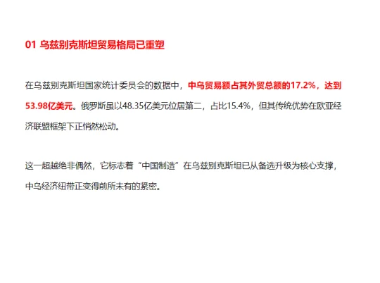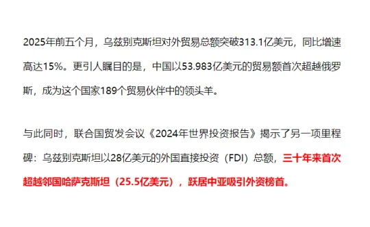 今年前五个月,乌兹别克斯坦对外贸易总额突破313.1亿美元,同比增速高达15%。更引人瞩目的是,中国以53.983亿美元的贸易额首次超越俄罗斯,成为这个国家189个贸易伙伴中的领头羊。这给中国外贸企业的机会是什么?