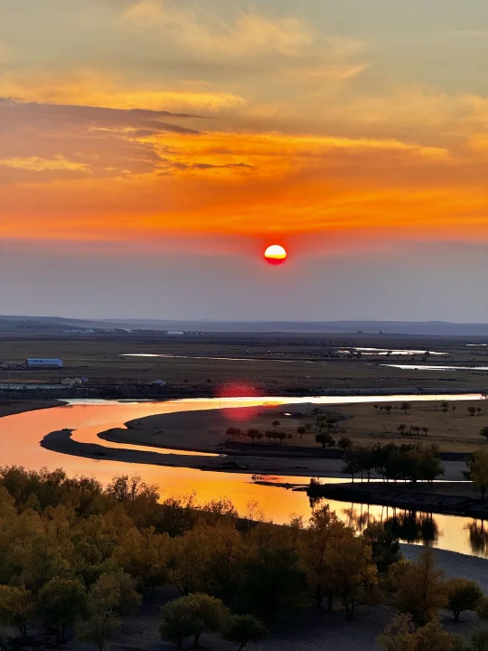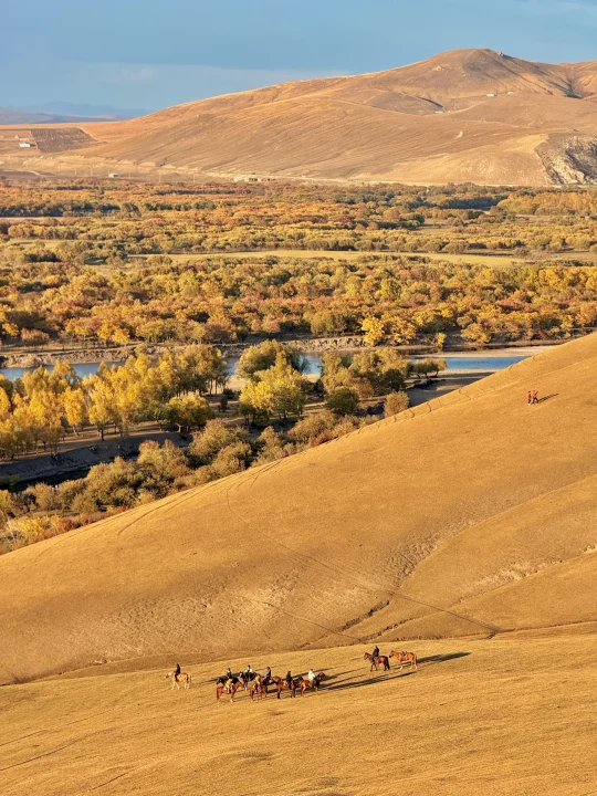 草原的开阔雄浑,配上河流弯弯绕绕的柔,把秋天的绚烂劲儿全铺开了