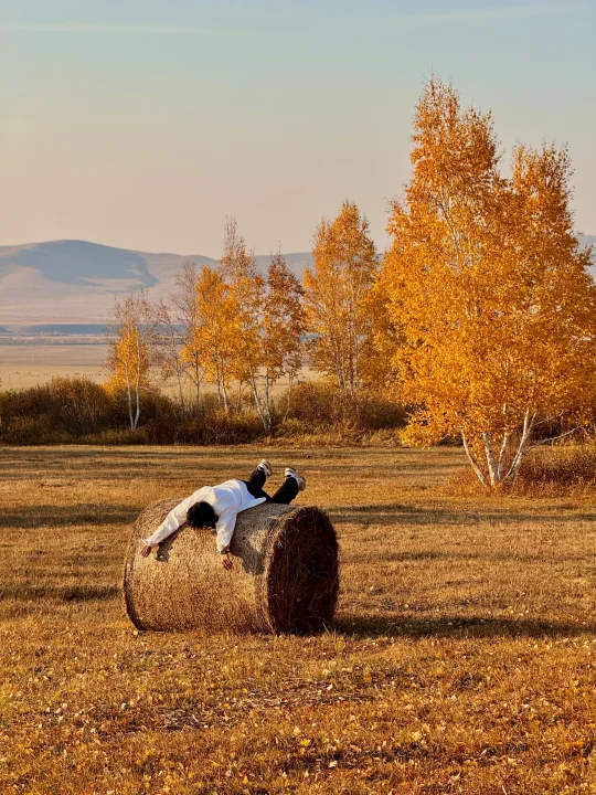 漫山白桦林叠着金黄,圆草垛子散在各处,躺上去眯着眼,恍惚间像回到了无忧无虑的童年