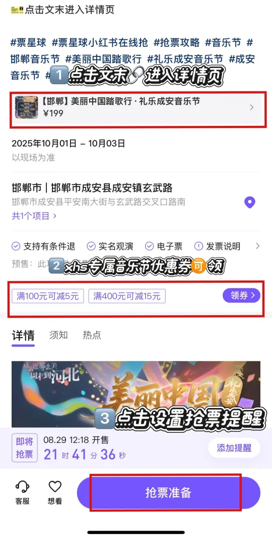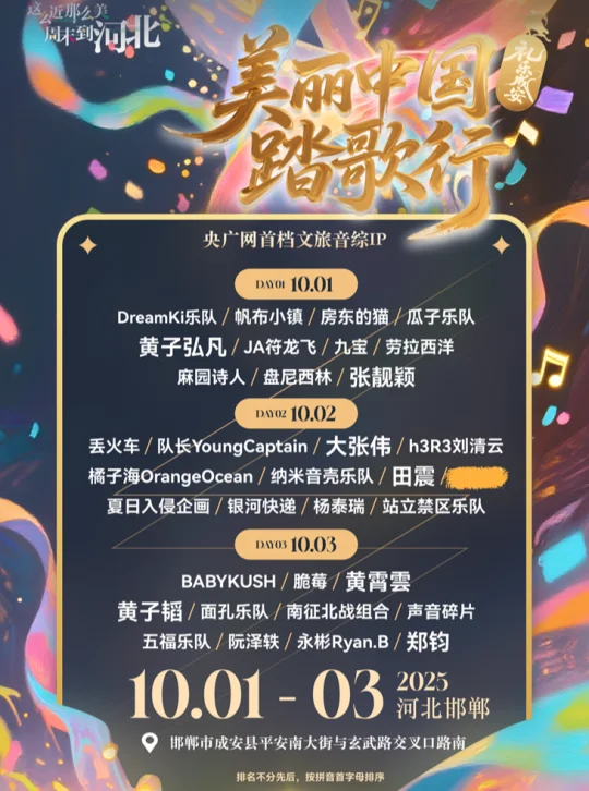邯郸成安音乐节!阵容超豪华!/张靓颖、黄子弘凡、房东的猫齐聚邯郸! 张靓颖、黄子、房东的猫……邯郸你有阵容如此豪华的音乐节入驻…… 10月1号,就在邯郸市成安县成安镇玄武路,都给我来看这个阵容超级豪华的音乐节! 👀演出阵容: DAY1:DreamKi乐队/帆布小镇/房东的猫/瓜子乐队/黄子弘凡/JA符龙飞/九宝/劳拉西洋/麻园诗人/盘尼西林/张靓颖 DAY2:丢火车/队长YoungCaptain/大张伟/h3R3刘清云/橘子海OrangeOcean/纳米音壳乐队/田震/夏日入侵企画/银河快递/杨泰瑞/站立禁区乐队... DAY3:BABYKUSH/脆莓/黄霄雲/黄子韬/面孔乐队/南征北战组合/声音碎片/五福乐队/阮泽轶/永彬Ryan.B/郑钧 开票就在明天!8月29日 12:18,购票还能减15r! 👇下方详情页即可go🎫
