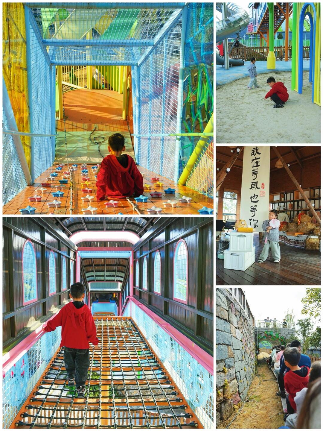 🛝里面有好几个大型的无动力娱乐设施,给小朋友爬上爬下,的去探险,每个边上都配套了椅子,方便家长们解放双手。