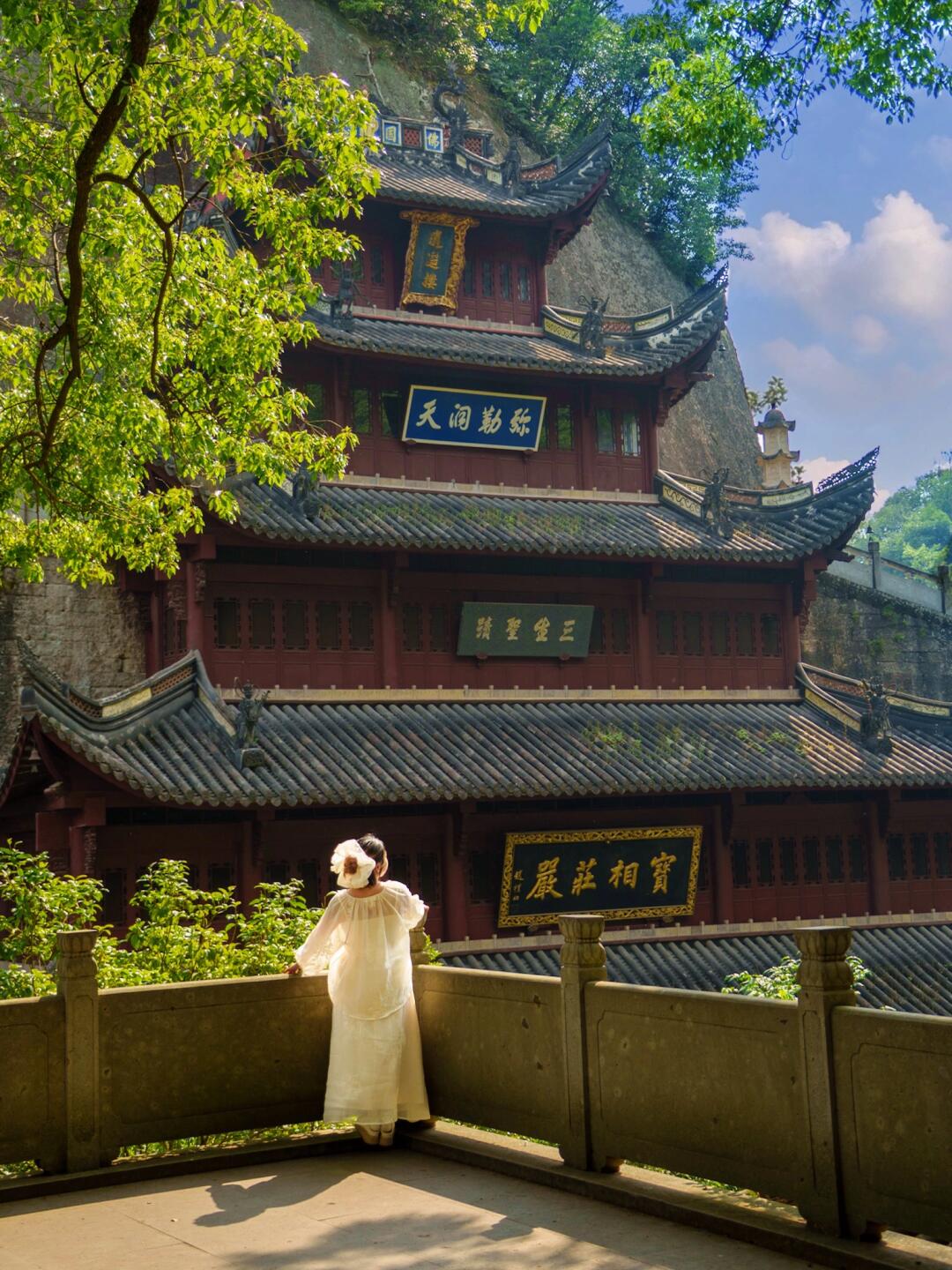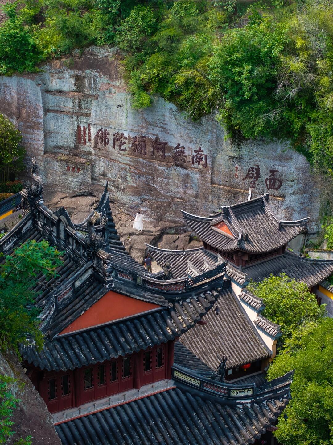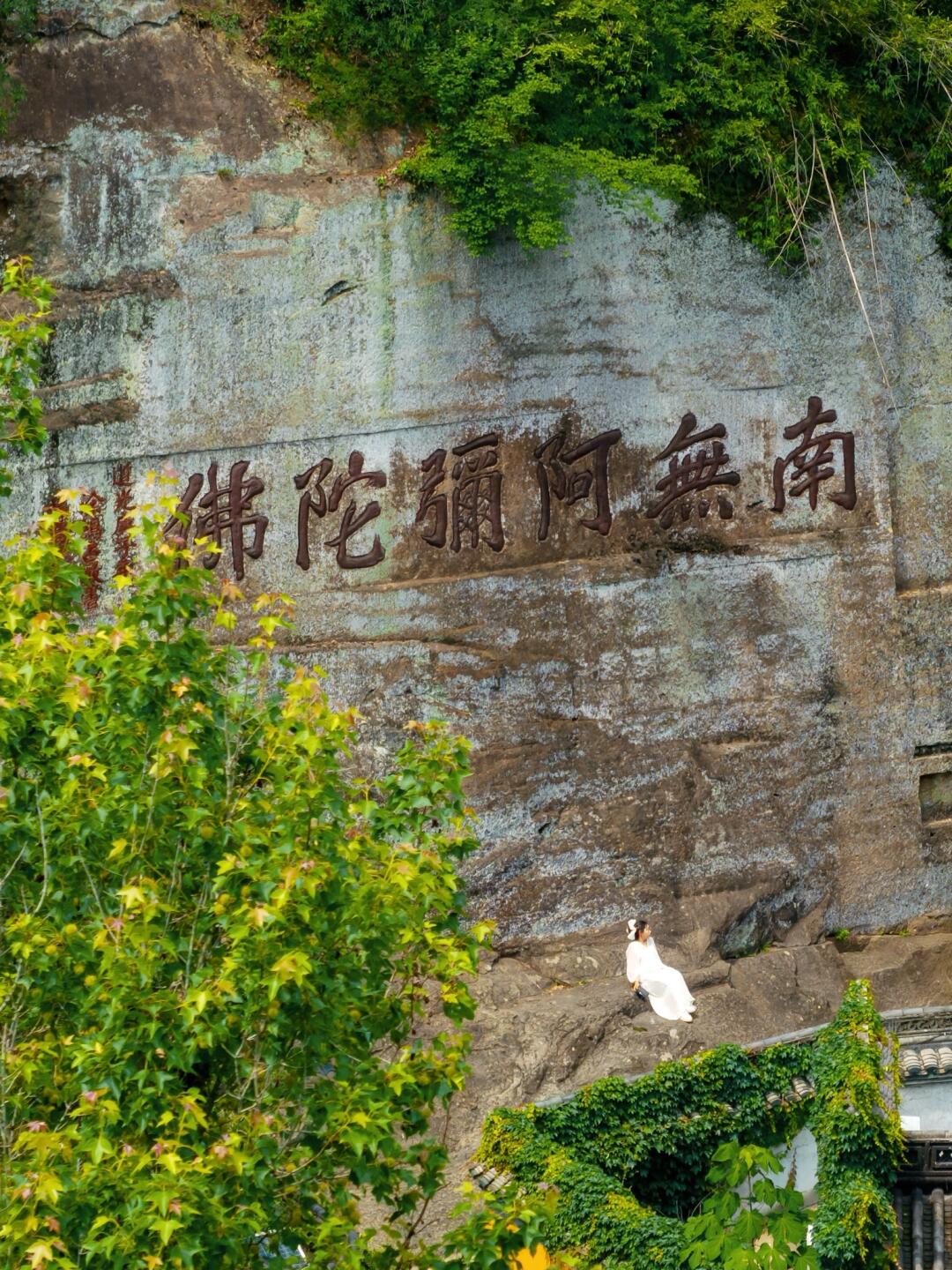 新昌俗语道“面壁石下停一停,不灵也得灵”。拍摄在面壁下许愿的打卡照。