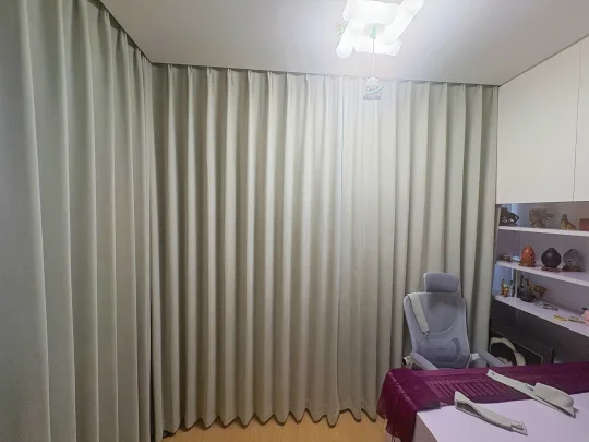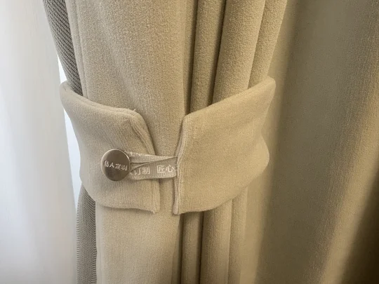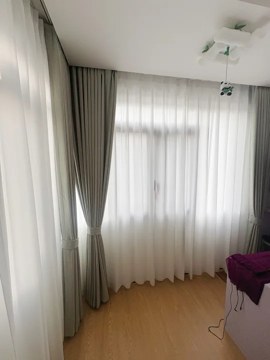 [星R][星R][星R]先说结果,我家选的加厚雪尼尔1450克+牙签纱(皇冠纱打底),客厅选的香格里拉帘,无纺布(图14)!凯美隆轨道(图13),韩式2倍熠皱,高温定型,可调节挂钩。