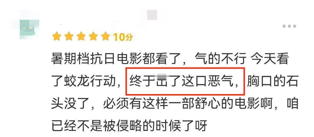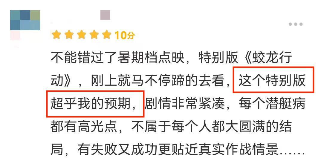 《蛟龙行动(特别版)》就像是一场配合9·3阅兵,在海中展开的海军武器阅兵一样,大国重器核潜艇的亮相,海军先进装备的展示,海军蛟龙突击队的特种作战能力和战斗意志,能让每一个中华儿女压抑的心情彻底释放! 9·3阅兵是一场向世界展示中国底气的盛会;《蛟龙行动》是一场向世界展示中国底气的电影! 看电影时我观察了一下,有不少影迷是第一次看,他们的状态应该是觉得春节错过了有遗憾,全是“哇塞”“太燃了”的惊叹声,散场后观众都在疯狂安利!这么硬核的国产战争片,错过真的血亏! 大家都感觉这部电影“超乎预期”,“剧情简直太顶了,太刺激了”,“明显比春节版更上一层楼!” 而且《蛟龙行动(特别版)》绝不只是一部简单的军事动作大片,它还有着深刻的内涵: 当外敌妄图侵犯我国主权,在深海领域蠢蠢欲动时,我们的潜艇和蛟龙小队,毫不犹豫地给予还击!粉碎外敌的狼子野心! 这无疑是对那些曾经侵略过我们的国家的有力回应,让国人心中积压已久的怒火得以宣泄,感到一雪前耻的畅快!