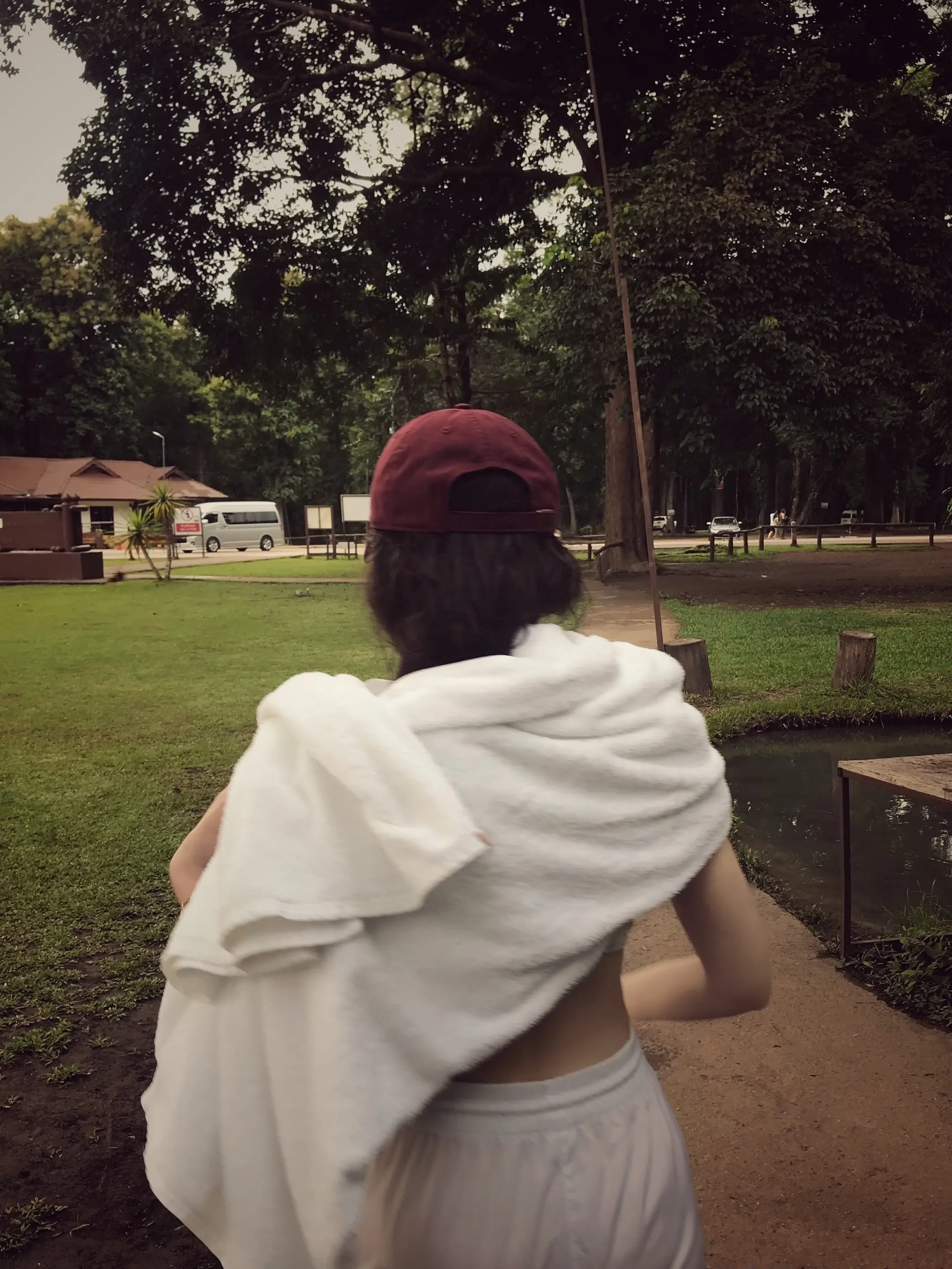 运动后放松时刻,穿红色卫衣,享受宁静时光。