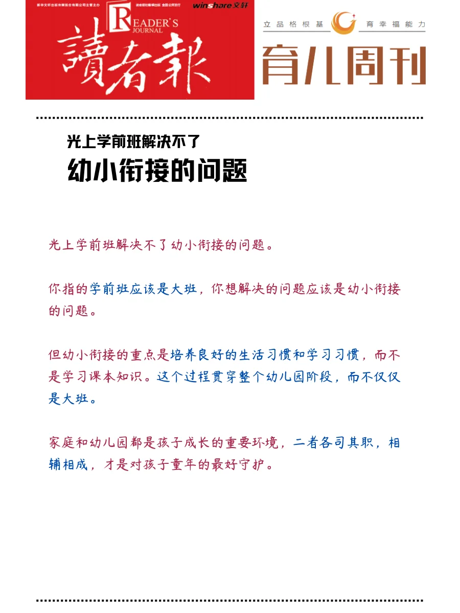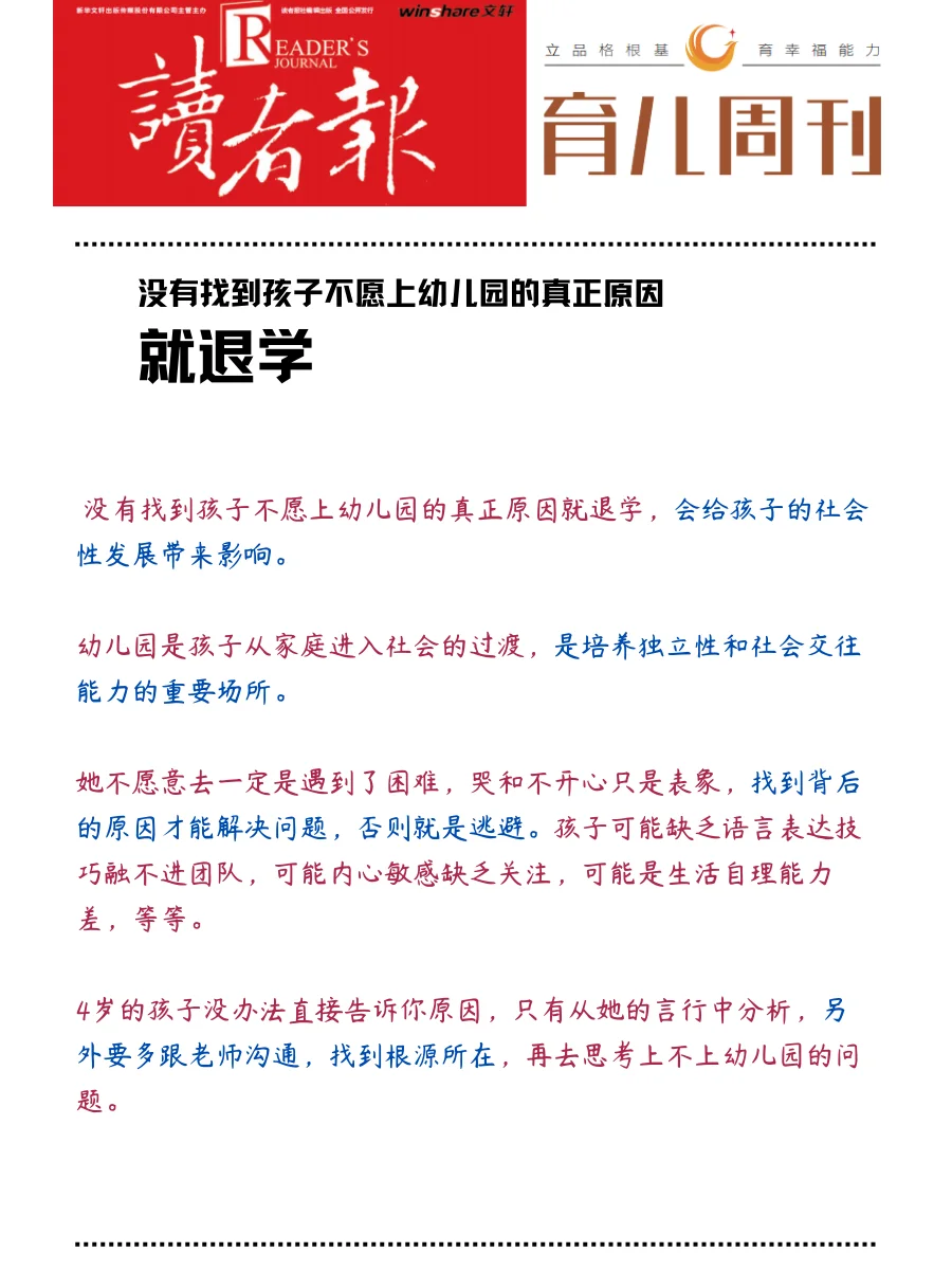 [吧唧R][吧唧R]建议三思,理由如下: [doge]首先,没有找到孩子不愿上幼儿园的真正原因就退学,会给孩子的社会性发展带来影响。 [doge]其次,幼儿园也是学习的专业场所。学前教育指对上小学前的孩子进行有计划教育。 [doge]最后,光上学前班解决不了幼小衔接的问题。