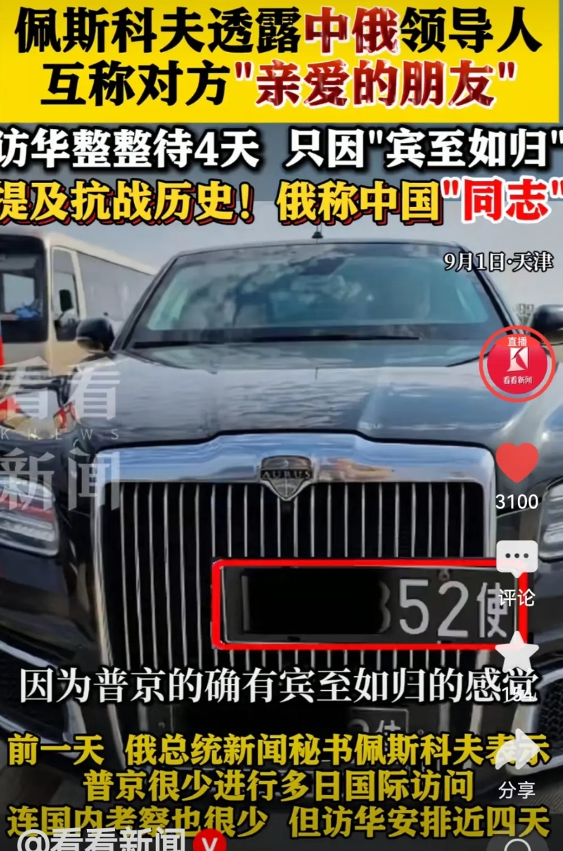 普京总统乘坐换上中国牌照的奥鲁斯专车抵达天津上合峰会现场。佩斯科夫透露,中俄领导人互称对方为“亲爱的朋友”。俄罗斯高度评价我们的中国同志对历史的珍视,俄中两国正在共同维护历史记忆!