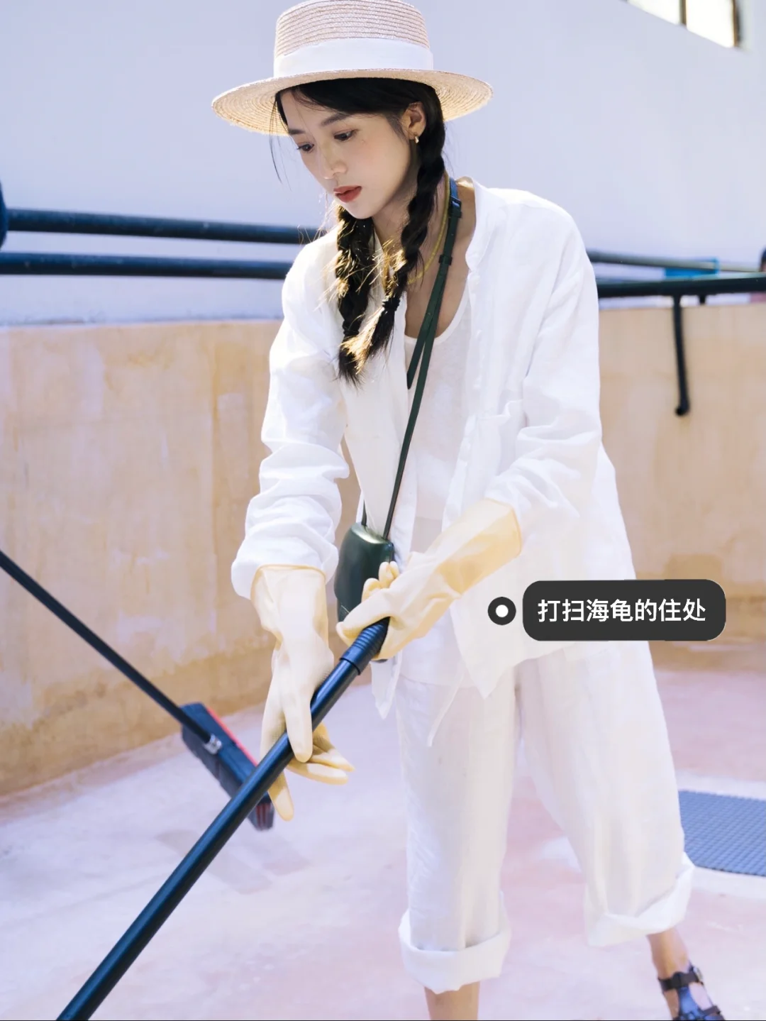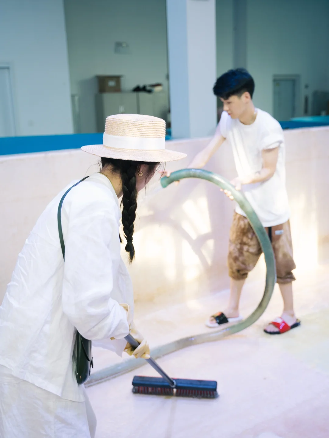 北京的大哥拿着超级大的水管一遍遍冲洗用于被救助海龟居住的水池 湿透了全身