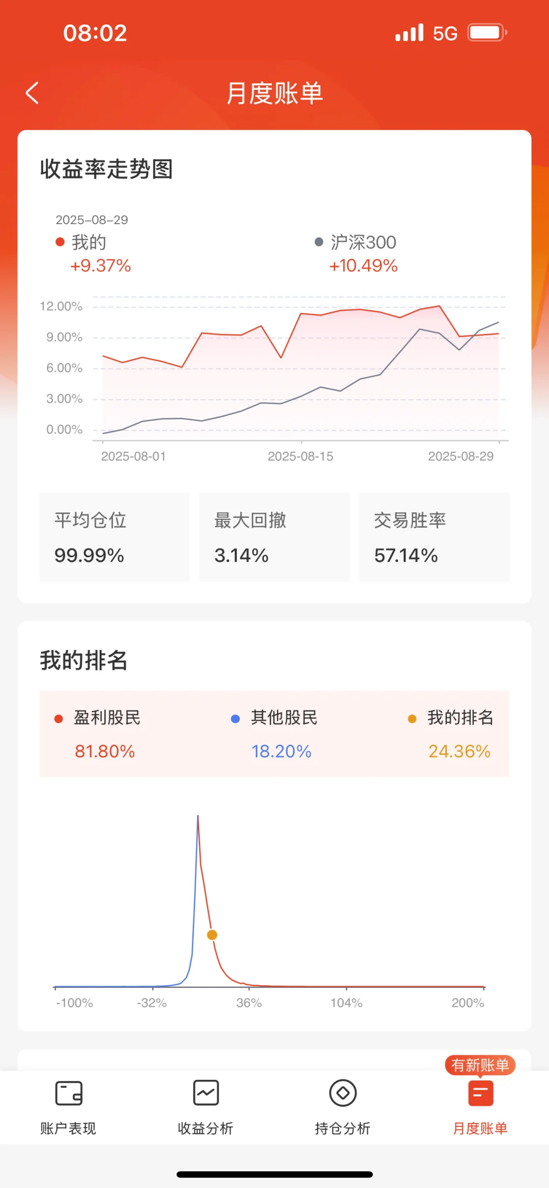这次最大的收获,是解决了灵魂安放的问题,再就是股票有了一个非常成熟的模型,八月份的收益还行,我挺满意的,和身经百战的朋友在一起有这样的排名已经很好了。