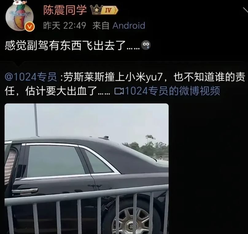 陈震又阴阳小米yu7了?劳斯莱斯与小米yu7相撞事故,陈震很快就转发,文中暗示小