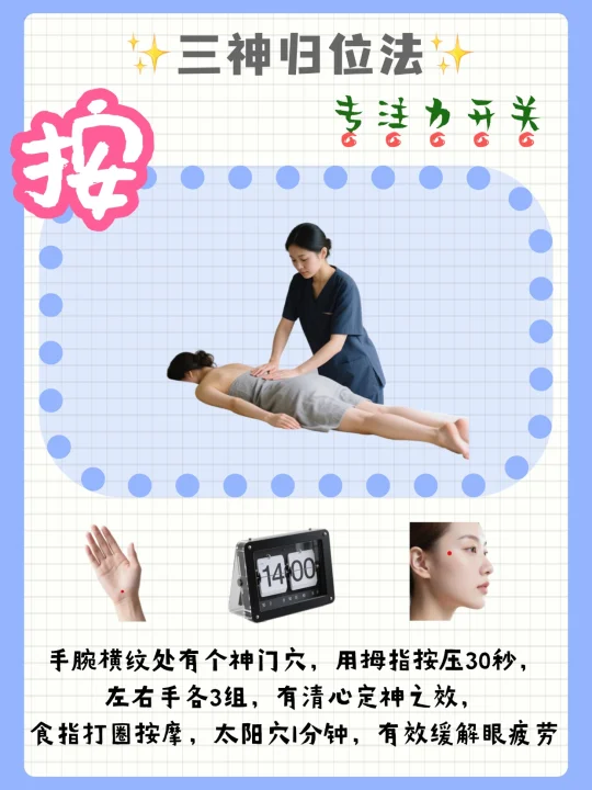 ▪️ 神门穴(手腕横纹处):拇指按压30秒,左右手各3组(清心定神)
