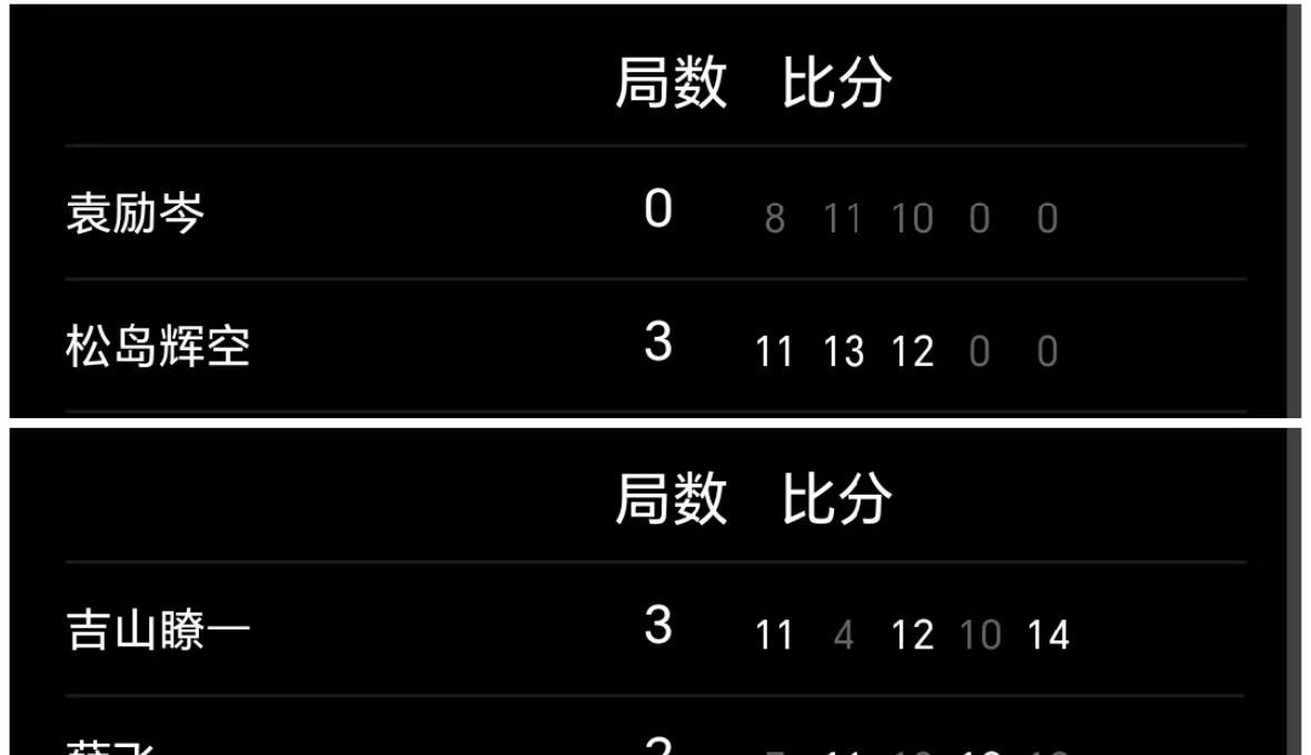 9月4日WTT常规挑战赛阿拉木图站赛果 袁励岑 薛飞 好兄弟一起出局 袁励岑0:3松岛辉空, 小袁,哎呀, 也不至于一局没拿下吧? 这样的比分让人感到心塞啊! 很关键的关键分, 薛飞2:3吉山暸一 输的太可惜, 决胜局二分之差,惜败! 首天正赛, 国乒男女单打各损失二名球员, 第三名球员在损失的路上(内战) 纵歌曼,王晓彤都输给了日乒 削球选手! 石洵瑶3:0张翔宇…… 国乒首日损失惨重,