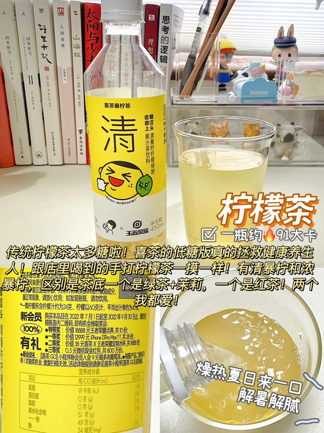 从小在深圳长大,真的很爱柠檬茶,但传统柠檬茶太多糖啦!喜茶低糖版真的拯救健康养生人!跟店里喝到的手打柠檬茶一摸一样!燥热的夏天来一口冷藏的柠檬茶,解暑解腻,倍感世界美好!有清暴柠和浓暴柠,区别是茶底一个是绿茶+茉莉,一个是红茶!两个我都爱!