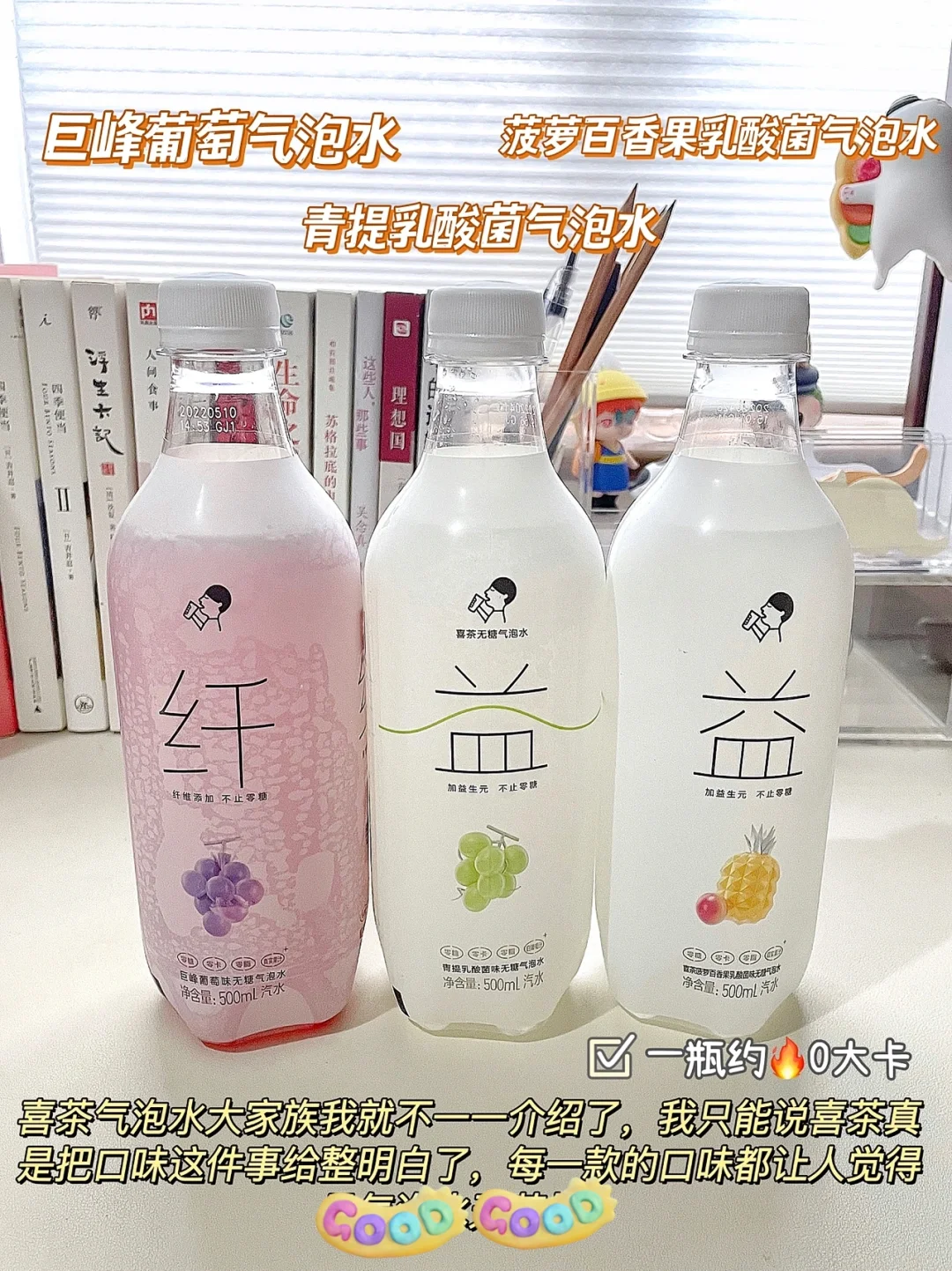 喜茶气泡水我就不一一介绍了,有巨峰葡萄味、海盐荔枝味、海盐柚子味、青提乳酸菌味、菠萝百香果乳酸菌味,只能说喜茶真是把口味这件事给整明白了,每个口味都好喝的程度!0糖0卡0脂口味丰富真的很难不爱!成年人不做选择,我都是一次囤一箱,每个口味都能拥有!