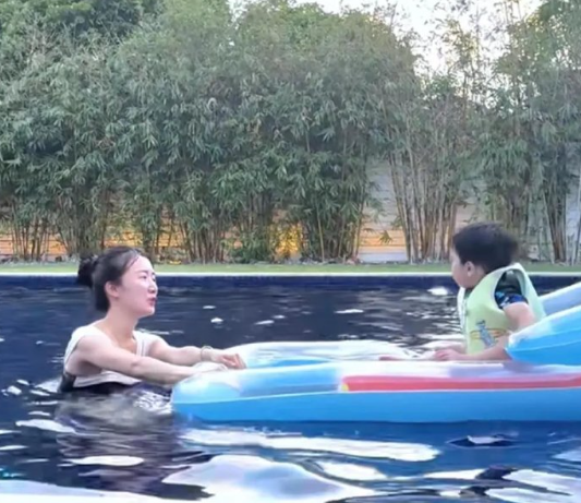 李念在别墅中带孩子游泳!晒豪宅带私人泳池,穿黑色长袍秀大长腿,豪门爱情让人羡慕,都不出来拍戏了吗?